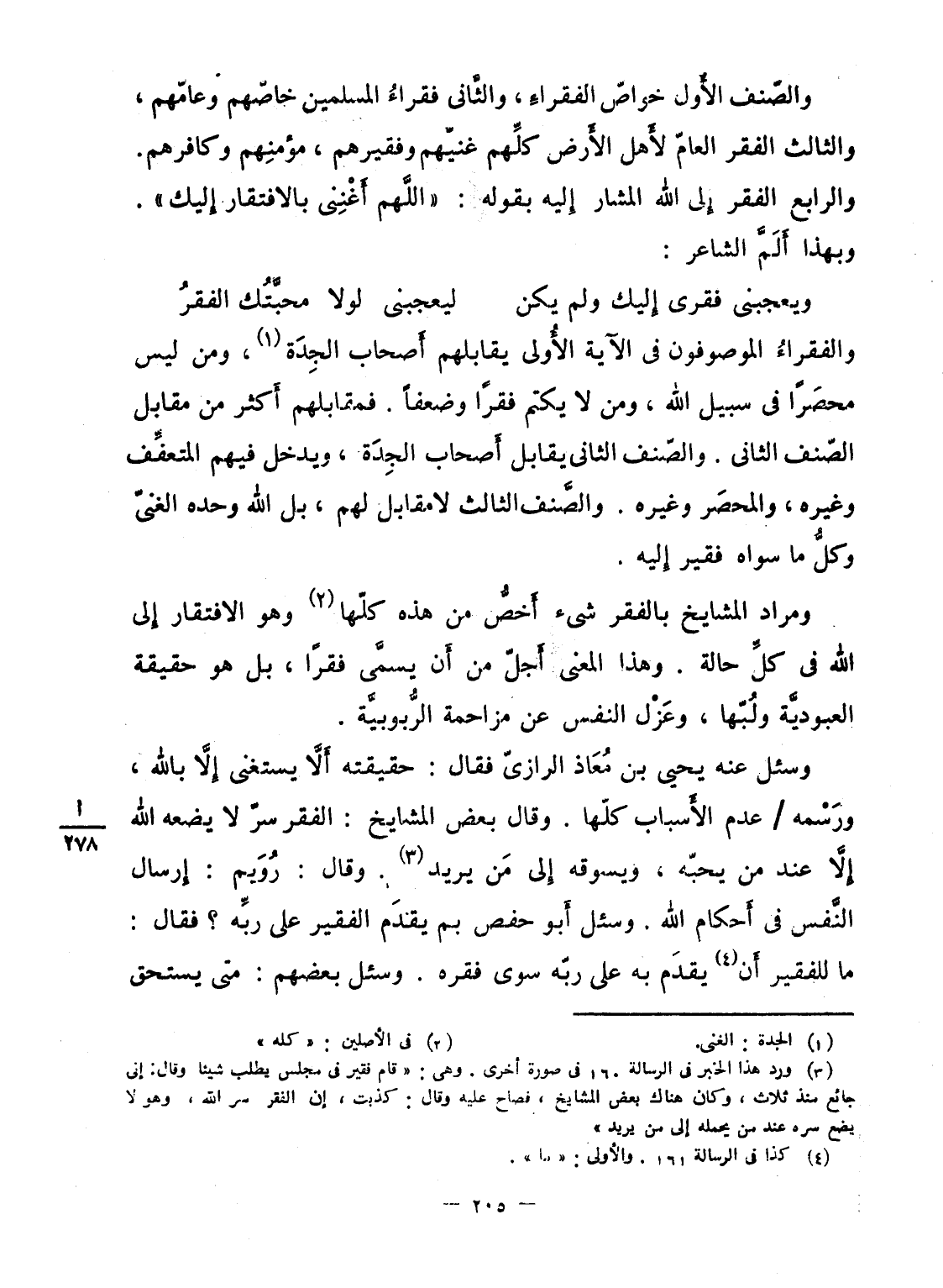 والصّنف الأَول خواصّ الفقراءِ، والثَّانى فقراءُ المسلمين خاصّهم وعامّهم، والثالث الفقر العامّ لأَهل الأَرض كلِّهم غنيّهم وفقيرهم، مؤمِنهم وكافرهم. والرابع الفقر إِلى الله المشار إِليه بقوله: "اللَّهم أَغْنِنى بالافتقار إِليك". وبهذا أَلَمَّ الشاعر:
