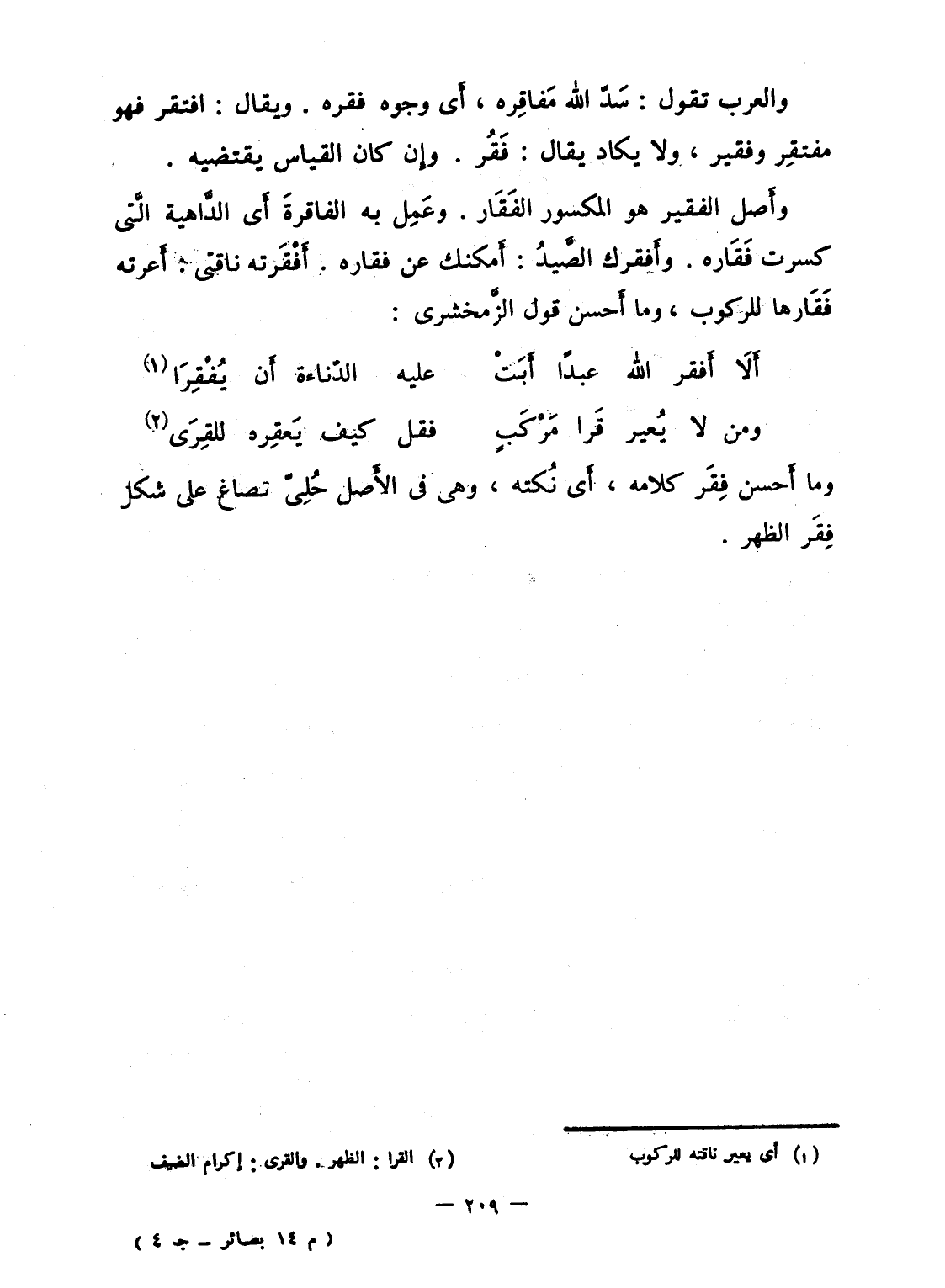 والعرب تقول: سَدّ الله مَفاقِره، أَى وجوه فقره. ويقال: افتقر فهو مفتقِر وفقير، ولا يكاد يقال: فَقُر. وإِن كان القياس يقتضيه.
