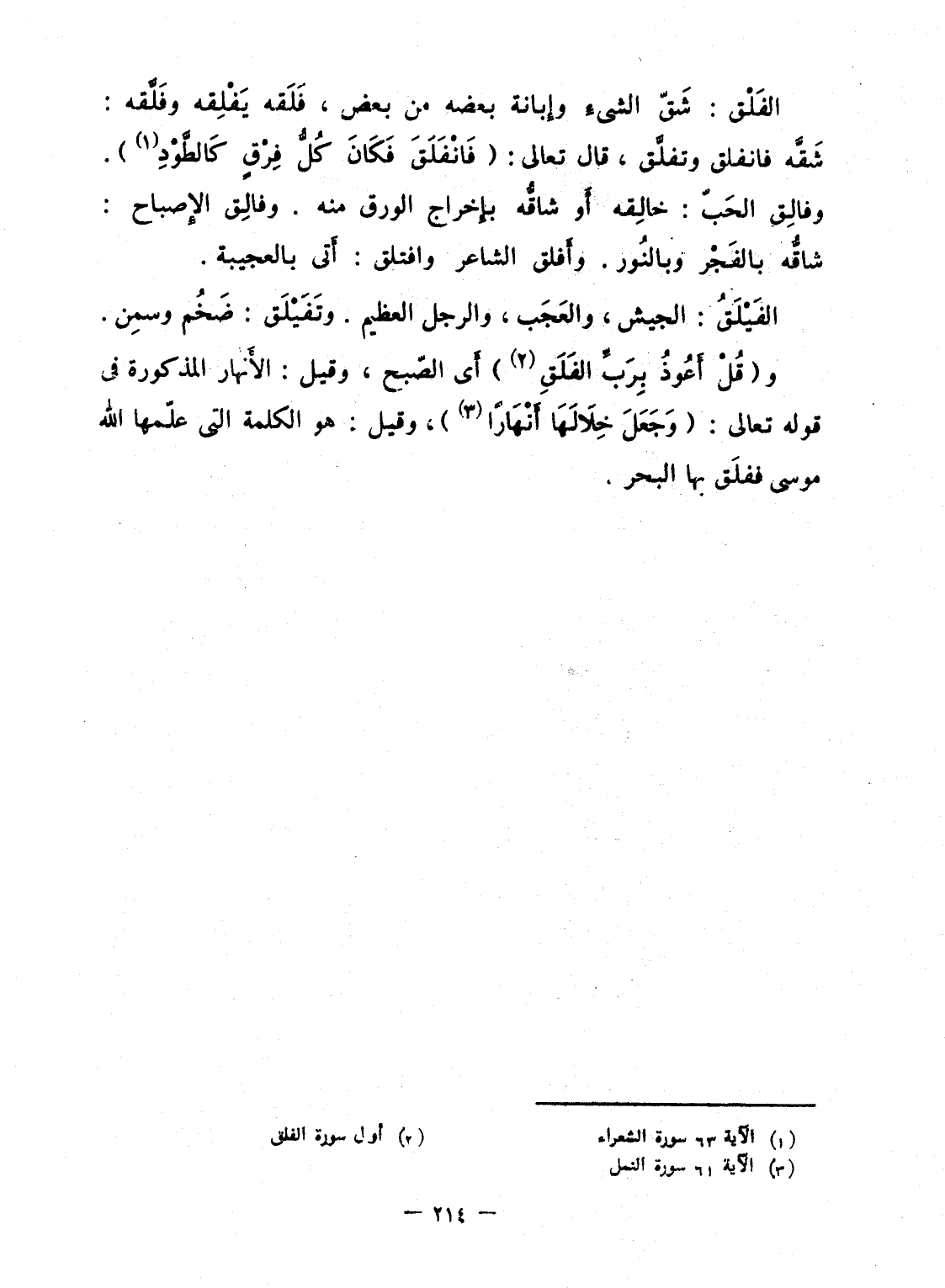 و {قُلْ أَعُوذُ بِرَبِّ الفلق} أَى الصّبح، وقيل: الأَنهار المذكورة فى قوله تعالى: {وَجَعَلَ خِلاَلَهَآ أَنْهَاراً} ، وقيل: هو الكلمة التى علّمها الله موسى ففلّق بها البحر.