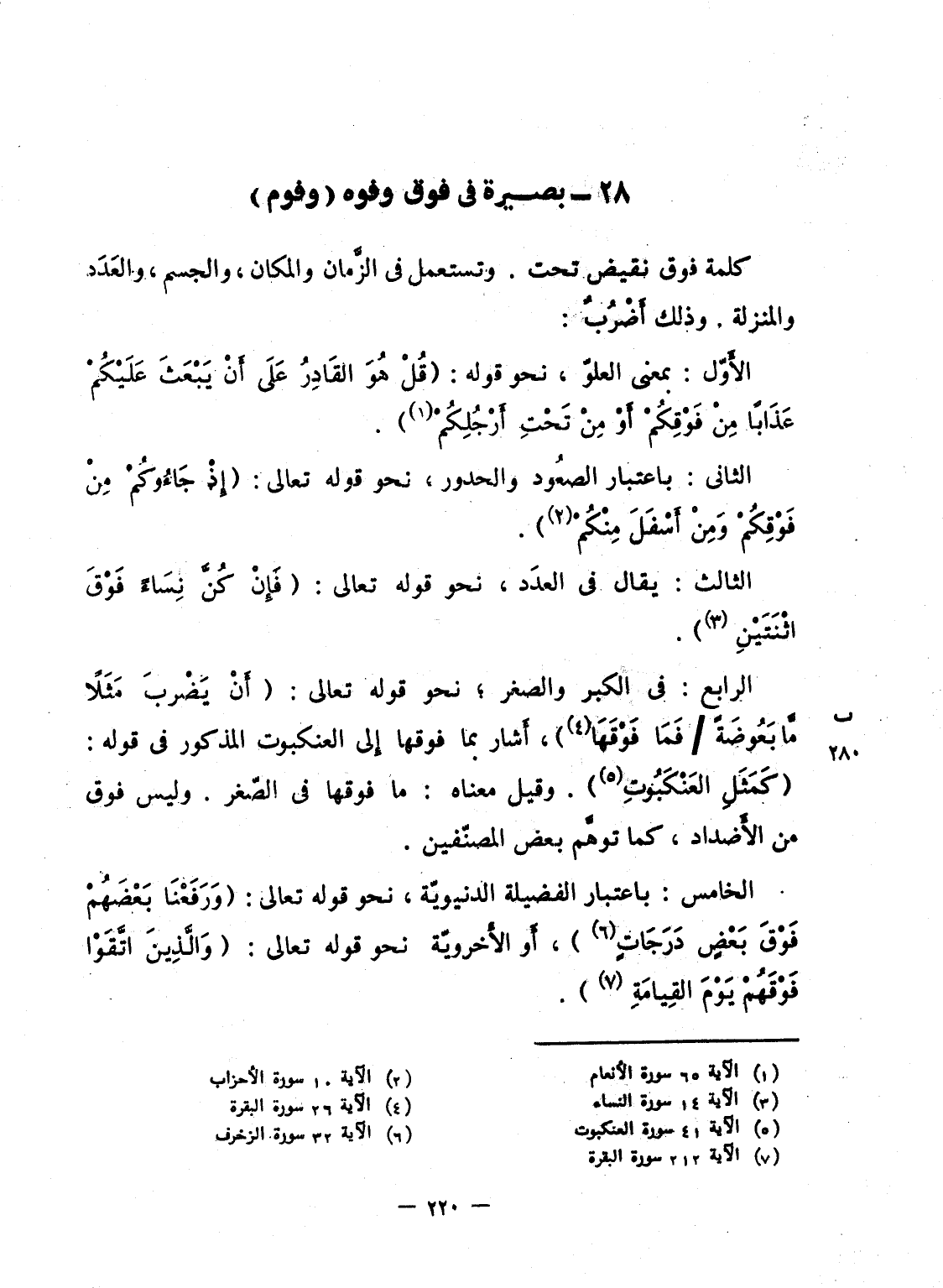 الخامس: باعتبار الفضيلة الدنيويّة، نحو قوله تعالى: {وَرَفَعْنَا بَعْضَهُمْ فَوْقَ بَعْضٍ دَرَجَاتٍ} ، أَو الأَخرويّة نحو قوله تعالى: {والذين اتقوا فَوْقَهُمْ يَوْمَ القيامة} .