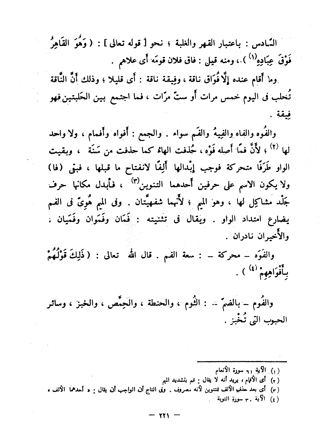 والفُوه والفاه والفِيهُ والفَم سواء. والجمع: أَفواه وأَفمام، ولا واحد لها؛ لأَنَّ فمًا أَصله فَوْه، حُذفت الهاءُ كما حذفت من سَنَة، وبقيت الواو طَرَفًا متحركة فوجب إِبْدالها أَلِفًا لانفتاح ما قبلها، فبقى (فا) ولا يكون الاسم على حرفين أَحدهما التنوين، فأبدك مكانها حرف جَلْد مشاكِل لها، وهو الميم؛ لأَنهما شفهيَّتان. وفى الميم هُوِىّ فى الفم يضارع امتداد الواو. ويقال فى تثنيته: فَمَان وفَمَوان وفَمَيان، والأَخيران نادران.