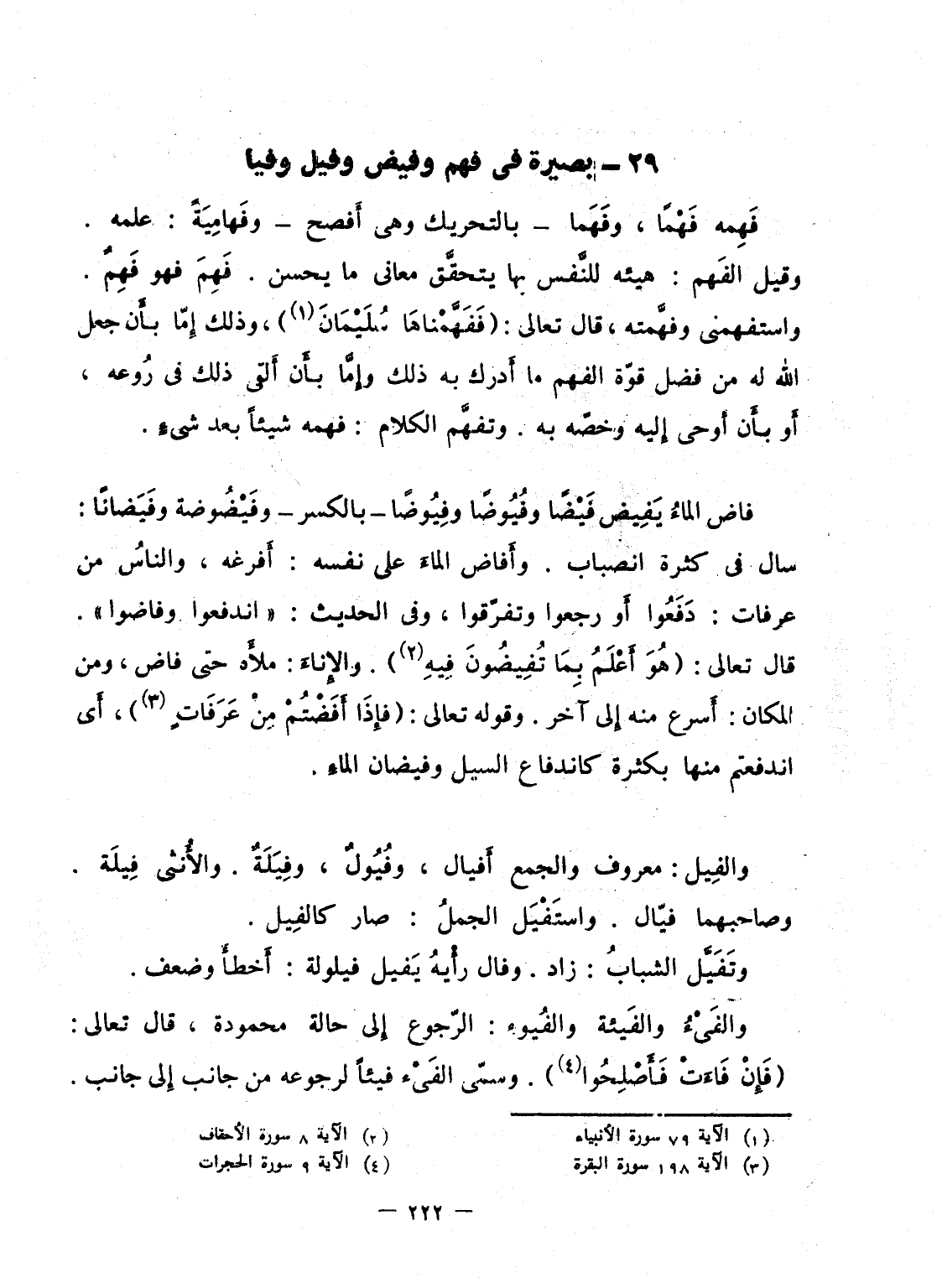 فاض الماءُ يَفِيض فَيْضًا وفُيُوضًا وفِيُوضًا - بالكسر - وفَيْضُوضة وفَيَضاناً: سال فى كثرة انصباب. وأَفاض الماءَ على نفسه: أَفرغه، والناسُ من عرفات: دَفَعُوا أَو رجعوا وتفرّقوا، وفى الحديث: "اندفعوا وفاضوا". قال تعالى: {هُوَ أَعْلَمُ بِمَا تُفِيضُونَ فِيهِ} . والإِناءَ: ملأَه حتى فاض، ومن المكان: أَسرع منه إِلى آخر. وقوله تعالى: {فَإِذَآ أَفَضْتُم مِّنْ عَرَفَاتٍ} ، أَى اندفعتم منها بكثرة كاندفاع السيل وفيضان الماءِ.