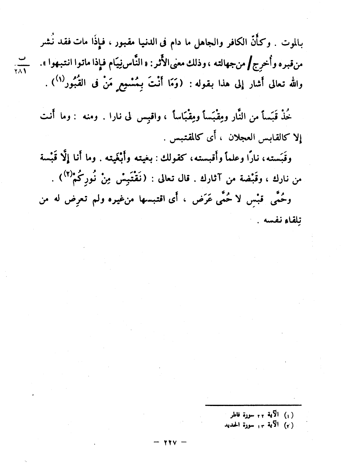 بالموت. وكأَنّ الكافر والجاهَل ما دام فى الدنيا مقبور، فإِذا مات فقد نشر من قبره وأُخرِج / من جهالته، وذلك معنى الأَثر: "النَّاس نِيَام فإِذا ماتوا انتبهوا". والله تعالى أَشار إِلى هذا بقوله: {وَمَآ أَنتَ بِمُسْمِعٍ مَّن فِي القبور} .