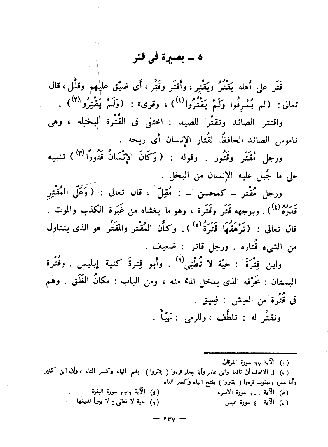ورجل مُقْتر - كمحسن -: مُقِلّ، قال تعالى: {وَعَلَى المقتر قَدَرُهُ} . ويوجهه قَتَر وقَتَرة، وهو ما يغشاه من غَبَرة الكذب والموت. قال تعالى: {تَرْهَقُهَا قَتَرَةٌ} . وكأَن المُقْتر والمقَتِّر هو الذى يتناول من الشىءِ قُتاره. ورجل قاتر: ضعيف.