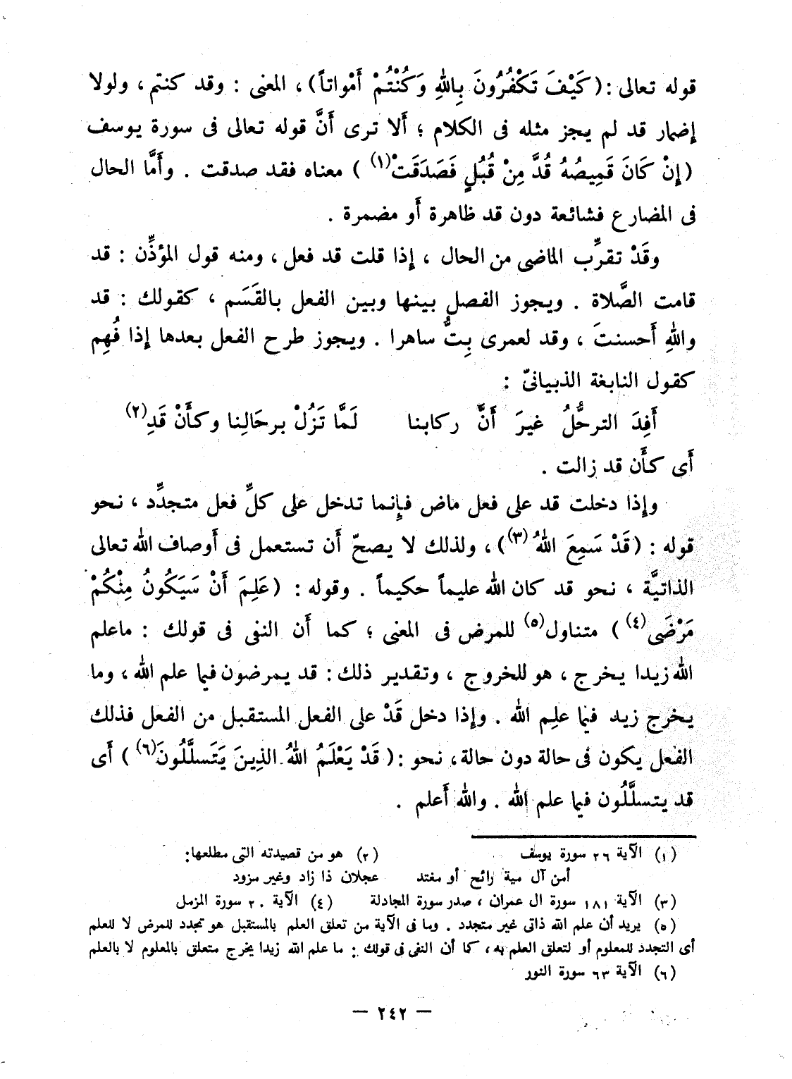 وإِذا دخلت قد على فعل ماض فإِنما تدخل على كلِّ فعل متجدِّد، نحو قوله: {قَدْ سَمِعَ الله} ، ولذلك لا يصحّ أَن تستعمل فى أَوصاف الله تعالى الذاتيَّة، نحو قد كان الله عليماً حكيماً. وقوله: {عَلِمَ أَن سَيَكُونُ مِنكُمْ مرضى} متناول للمرض فى المعنى؛ كما أَن النفى فى قولك: ما علم الله زيدا يخرج، هو للخروج، وتقدير ذلك: قد يمرضون فيما علم الله، وما يخرج زيد فيما علِم الله. وإِذا دخل قَدْ على الفعل المستقبل من الفعل فذلك الفعل يكون فى حالة دون حالة، نحو: {قَدْ يَعْلَمُ الله الذين يَتَسَلَّلُونَ} أَى قد يتسلَّلُون فيما علم الله. والله أَعلم.
