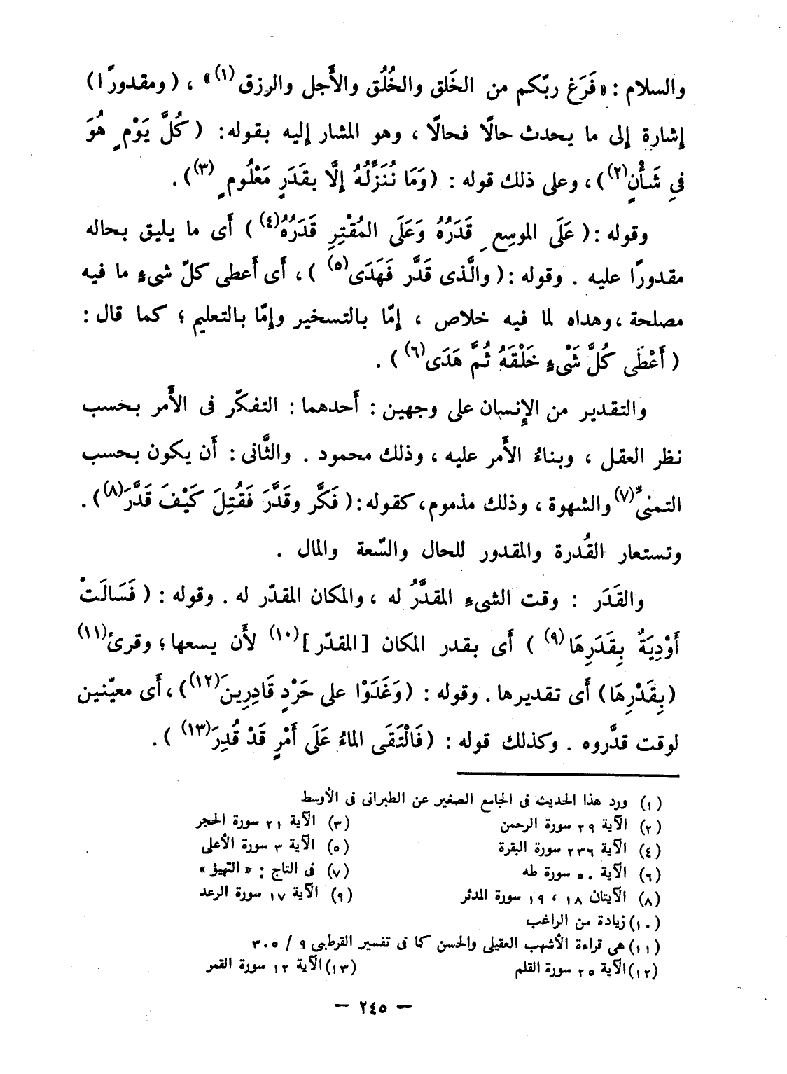 والقَدَر: وقت الشىءِ المقدَّرُ له، والمكان المقدّر له. وقوله: {فَسَالَتْ أَوْدِيَةٌ بِقَدَرِهَا} أَى بقدر المكان [المقدّر] لأَن يسعها؛ وقرئ (بِقَدْرِهَا) أَى تقديرها. وقوله: {وَغَدَوْاْ على حَرْدٍ قَادِرِينَ} ، أَى معيّنين لوقت قدَّروه. وكذلك قوله: {فَالْتَقَى المآء على أَمْرٍ قَدْ قُدِرَ} .