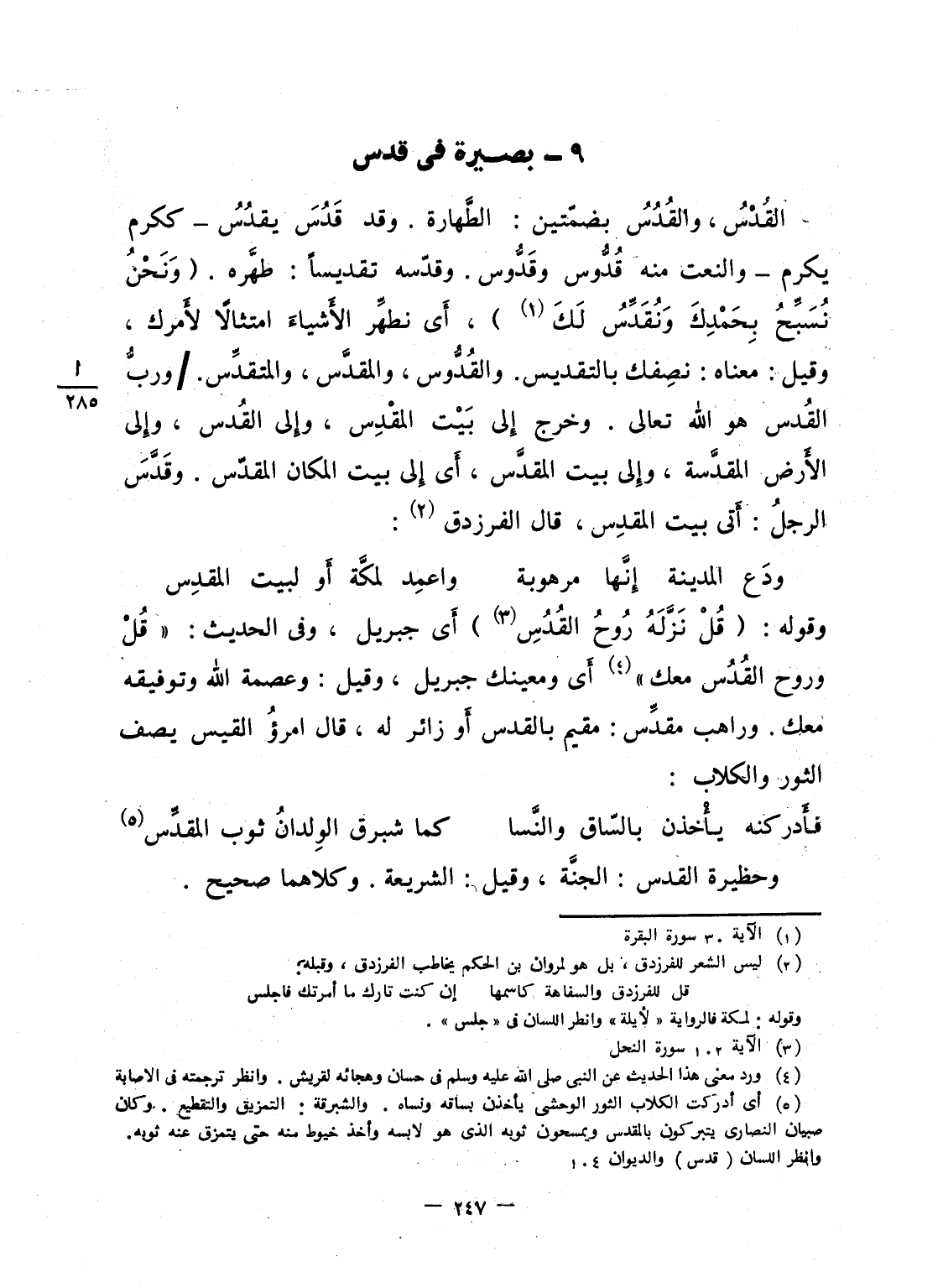 القُدْسُ، والقُدُسُ بضمّتين: الطَّهارة. وقد قَدُسَ يقدُسُ - ككرم يكرم - والنعت منه قُدُّوس وقَدُّوس. وقدّسه تقديساً: طهَّره. {وَنَحْنُ نُسَبِّحُ بِحَمْدِكَ وَنُقَدِّسُ لَكَ} ، أَى نطهِّر الأَشياءَ امتثالاً لأَمرك، وقيل: معناه: نصِفك بالتقديس. والقُدُّوس، والمقدَّس، والمتقدِّس. / وربُّ القُدس هو الله تعالى. وخرج إِلى بَيْت المقْدِس، وإِلى القُدس، وإِلى الأَرض المقدَّسة، وإِلى بيت المقدَّس، أَى إِلى بيت المكان المقدّس. وقَدَّسَ الرجلُ: أَتى بيت المقدِس، قال الفرزدق: