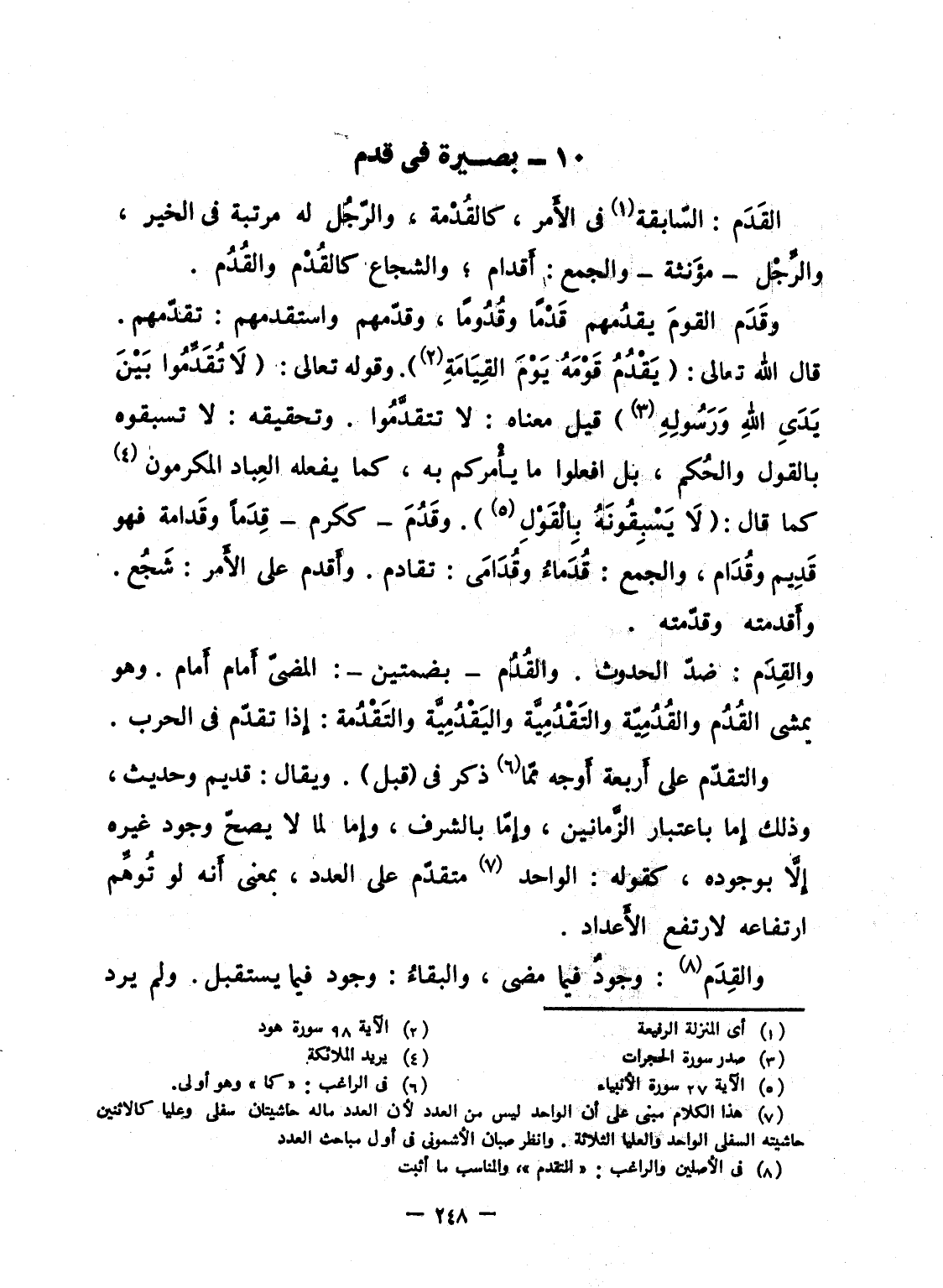 وقَدَم القومَ يقدُمهم قَدْمًا وقُدُومًا، وقدّمهم واستقدمهم: تقدّمهم. قال الله تعالى: {يَقْدُمُ قَوْمَهُ يَوْمَ القيامة} . وقوله تعالى: {لاَ تُقَدِّمُواْ بَيْنَ يَدَيِ الله وَرَسُولِهِ} قيل معناه: لا تتقدَّمُوا. وتحقيقه: لا تسبقوه بالقول والحُكم، بل افعلوا ما يأْمركم به، كما يفعله العِباد المكرمون كما قال: {لاَ يَسْبِقُونَهُ بالقول} . وقَدُمَ - ككرم - قِدَماً وقَدامة فهو قَدِيم وقُدَام، والجمع: قُدَماءُ وقُدَامَى: تقادم. وأَقدم على الأَمر: شَجُع. وأَقدمته وقدّمته.