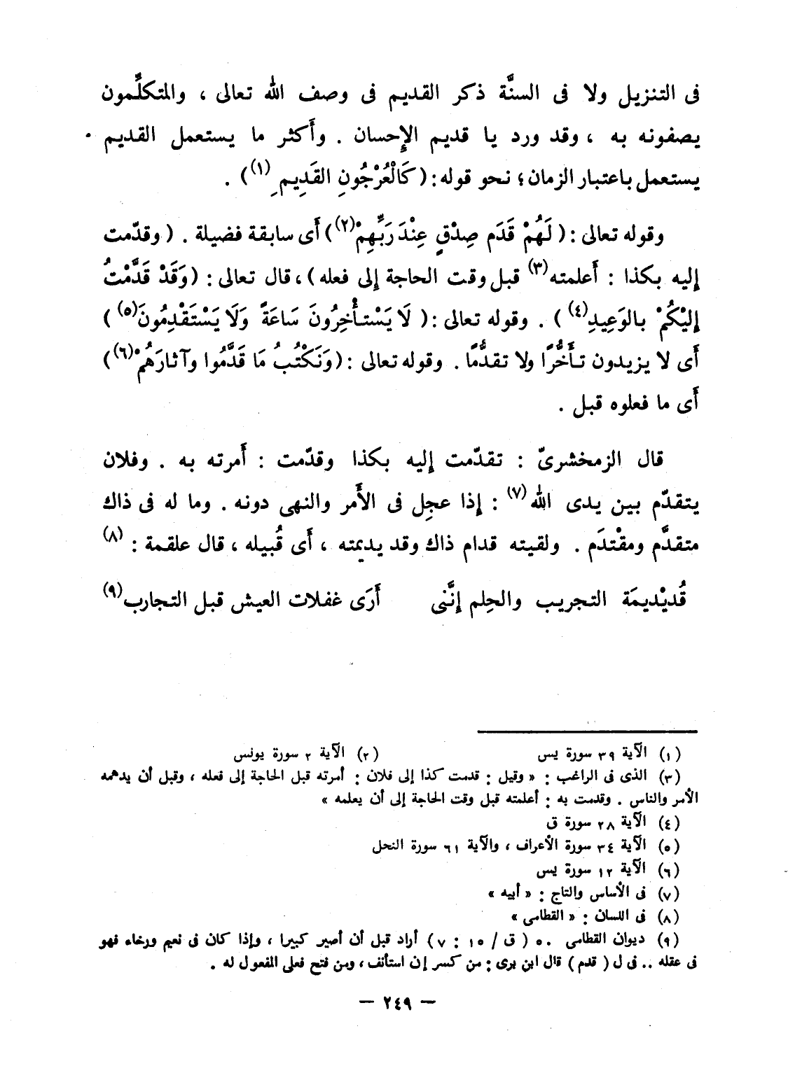 وقوله تعالى: {لَهُمْ قَدَمَ صِدْقٍ عِندَ رَبِّهِمْ} أَى سابقة فضيلة. (وقدّمت إِليه بكذا: أَعلمته قبل وقت الحاجة إِلى فعله) ، قال تعالى: {وَقَدْ قَدَّمْتُ إِلَيْكُم بالوعيد} . وقوله تعالى: {لاَ يَسْتَأْخِرُونَ سَاعَةً وَلاَ يَسْتَقْدِمُونَ} أَى لا يزيدون تأَخُّرًا ولا تقدُّمًا. وقوله تعالى: {وَنَكْتُبُ مَاَ قَدَّمُواْ وَآثَارَهُمْ} أَى ما فعلوه قبل.