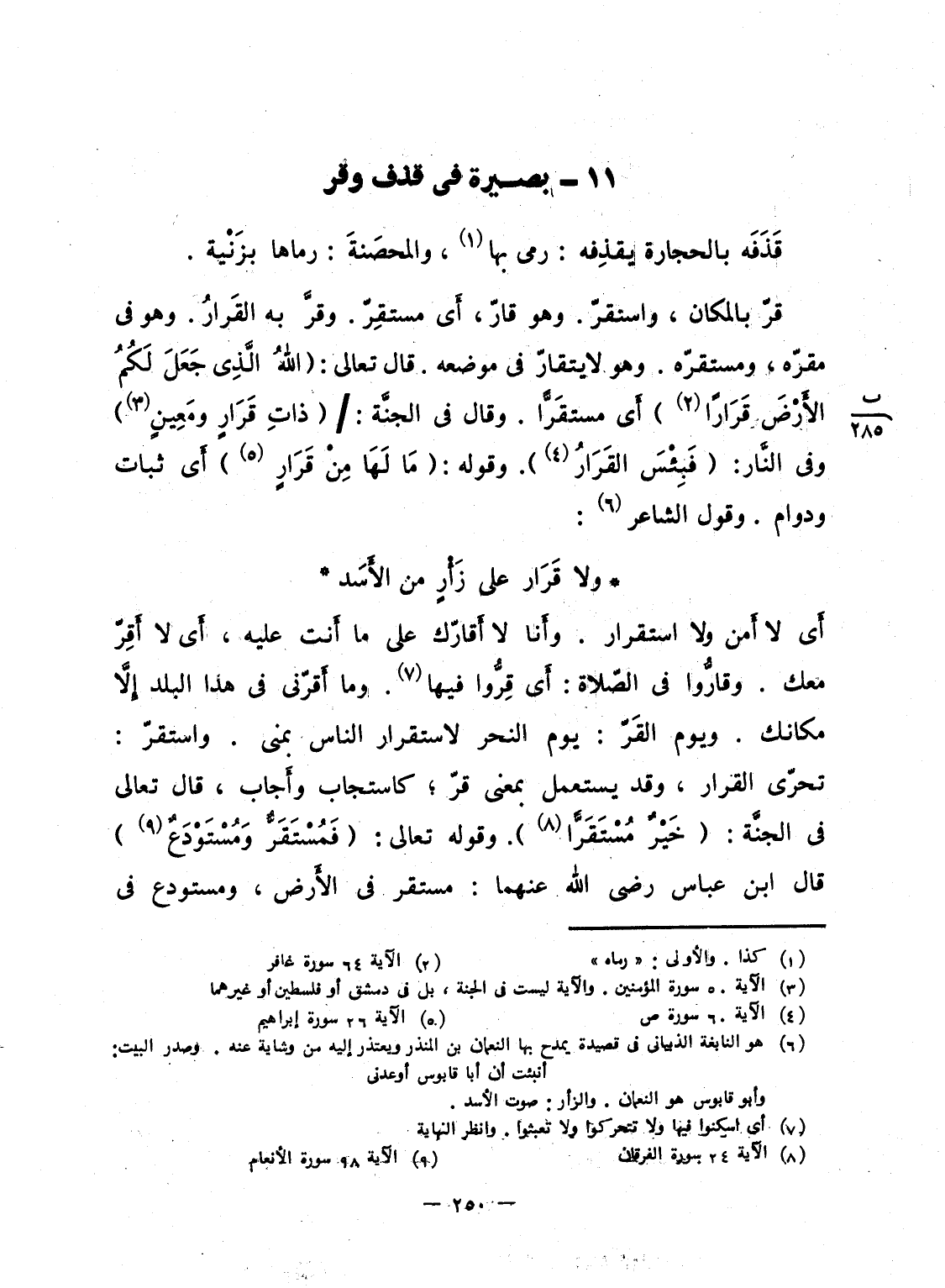 قرّ بالمكان، واستقرّ. وهو قارّ، أَى مستقِرّ. وقرَّ به القَرارُ. وهو فى مقرّه، ومستقرّه. وهو لا يتقارّ فى موضعه. قال تعالى: {الله الذي جَعَلَ لَكُمُ الأرض قَرَاراً} أَى مستقَرًّا. وقال فى الجنَّة: / {ذَاتِ قَرَارٍ وَمَعِينٍ} وفى النَّار: {فَبِئْسَ القرار} . وقوله: {مَا لَهَا مِن قَرَارٍ} أَى ثبات ودوام. وقول الشاعر:
