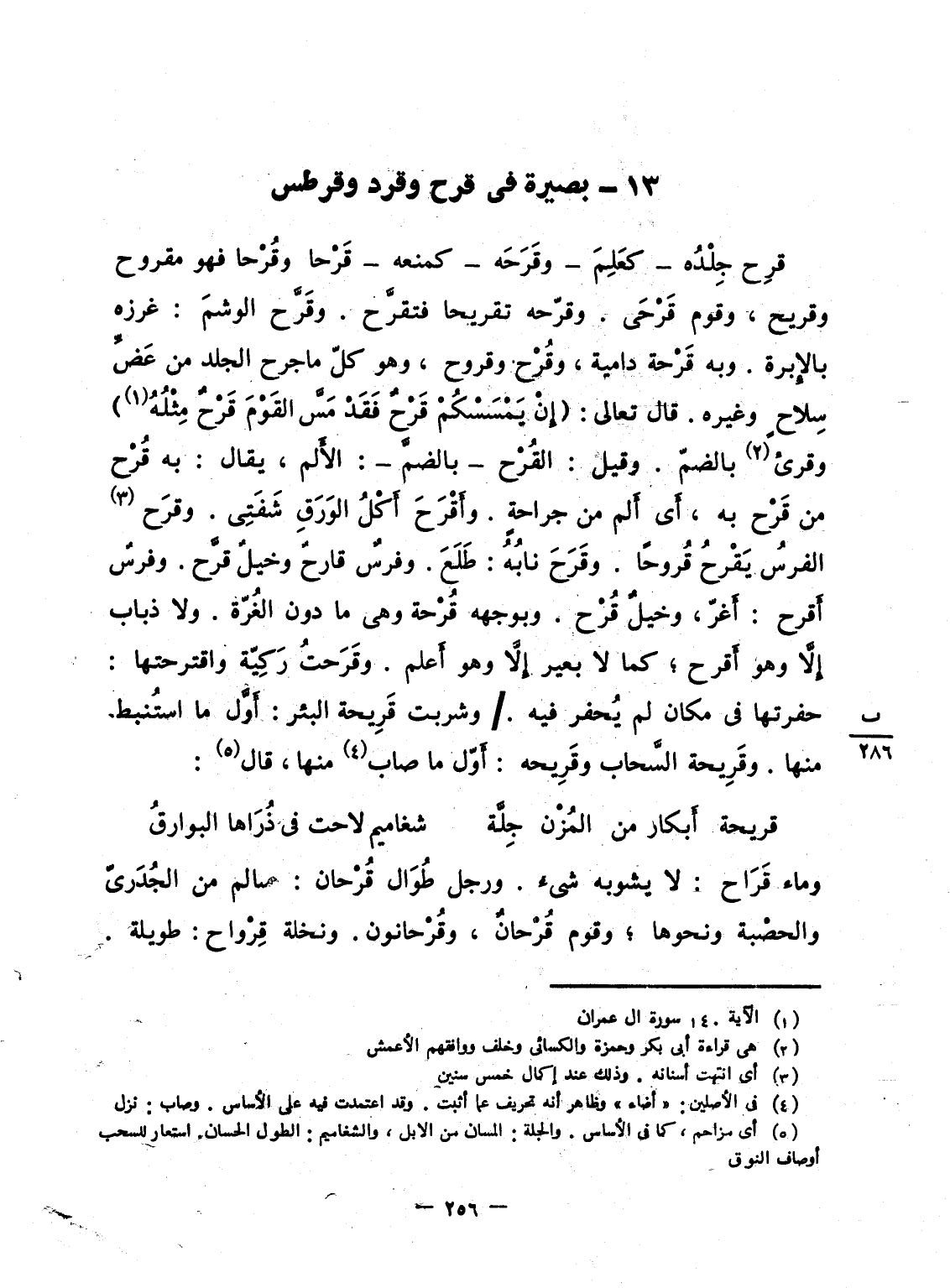 قرِح جِلْدُه - كعَلِمَ - وقَرَحَه - كمنعه - قَرْحا وقُرْحا فهو مقروح وقريح، وقوم قَرْحَى. وقرّحه تقريحا فتقرَّح. وقَرَّح الوشمَ: غرزه بالإِبرة. وبه قَرْحة دامية، وقُرْح وقروح، وهو كلّ ما جرح الجلد من عَضِّ سِلاحٍ وغيره. قال تعالى: {إِن يَمْسَسْكُمْ قَرْحٌ فَقَدْ مَسَّ القوم قَرْحٌ مِّثْلُهُ} وقرئ بالضمّ. وقيل: القُرْح - بالضمَّ -: الأَلم، يقال: به قُرْح من قَرْح به، أَى أَلم من جراحة. وأَقْرَحَ أَكْلُ الوَرَقِ شَفَتِى. وقرَح الفرُس يَقْرحُ قُروحاً. وقَرَحَ نابُهُ: طَلَعَ. وفرسٌ قارحٌ وخيلٌ قرَّح. وفرسٌ أَقرح: أَغرّ، وخيلٌ قُرْح. وبوجهه قُرْحة وهى ما دون الغُرّة. ولا ذباب إِلاَّ وهو أَقرح؛ كما لا بعير إِلاَّ وهو أَعلم. وقَرَحتُ رَكِيّة واقترحتها: حفرتها فى مكان لم يُحفر فيه. / وشربت قَرِيحة البئر: أَوَّل ما استُنبط منها. وقَرِيحة السَّحاب وقَرِيحه: أَوّل ما صاب منها، قال: