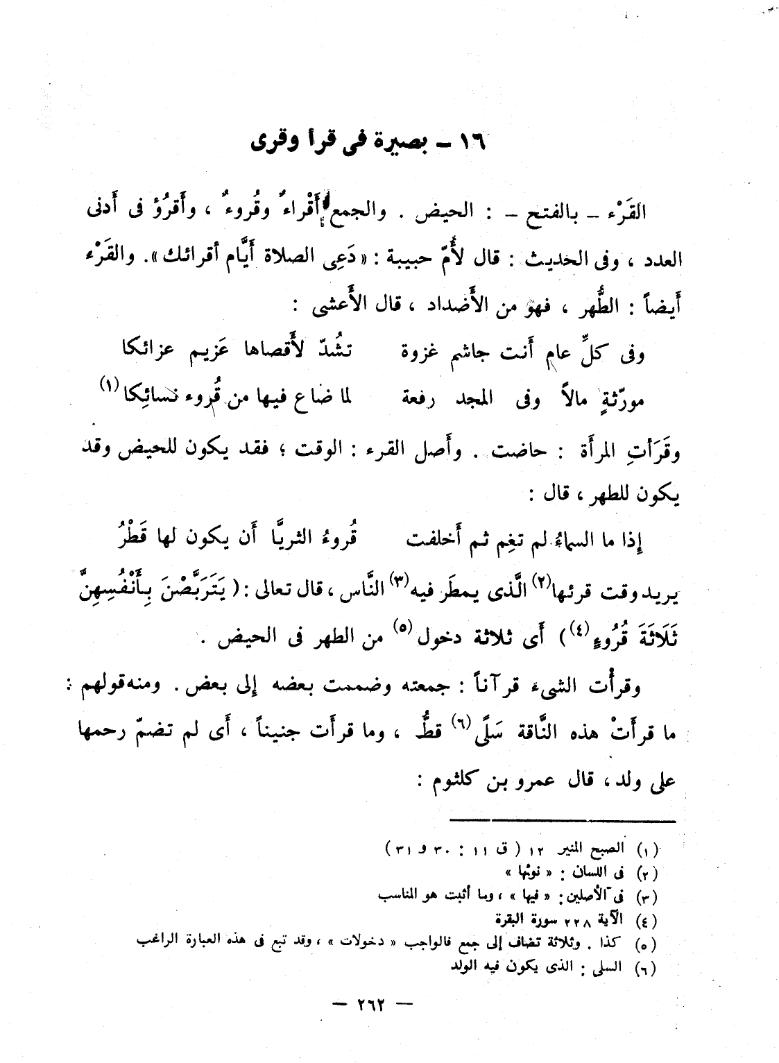 القَرْء - بالفتح -: الحيض. والجمع أَقْراءٌ وقُروءٌ، وأَقرُؤ فى أَدنى العدد، وفى الحديث: قال لأُمّ حبيبة: "دَعِى الصلاة أَيَّام أقرائك". والقَرْء أَيضاً: الطُّهر، فهو من الأَضداد، قال الأَعشى:
