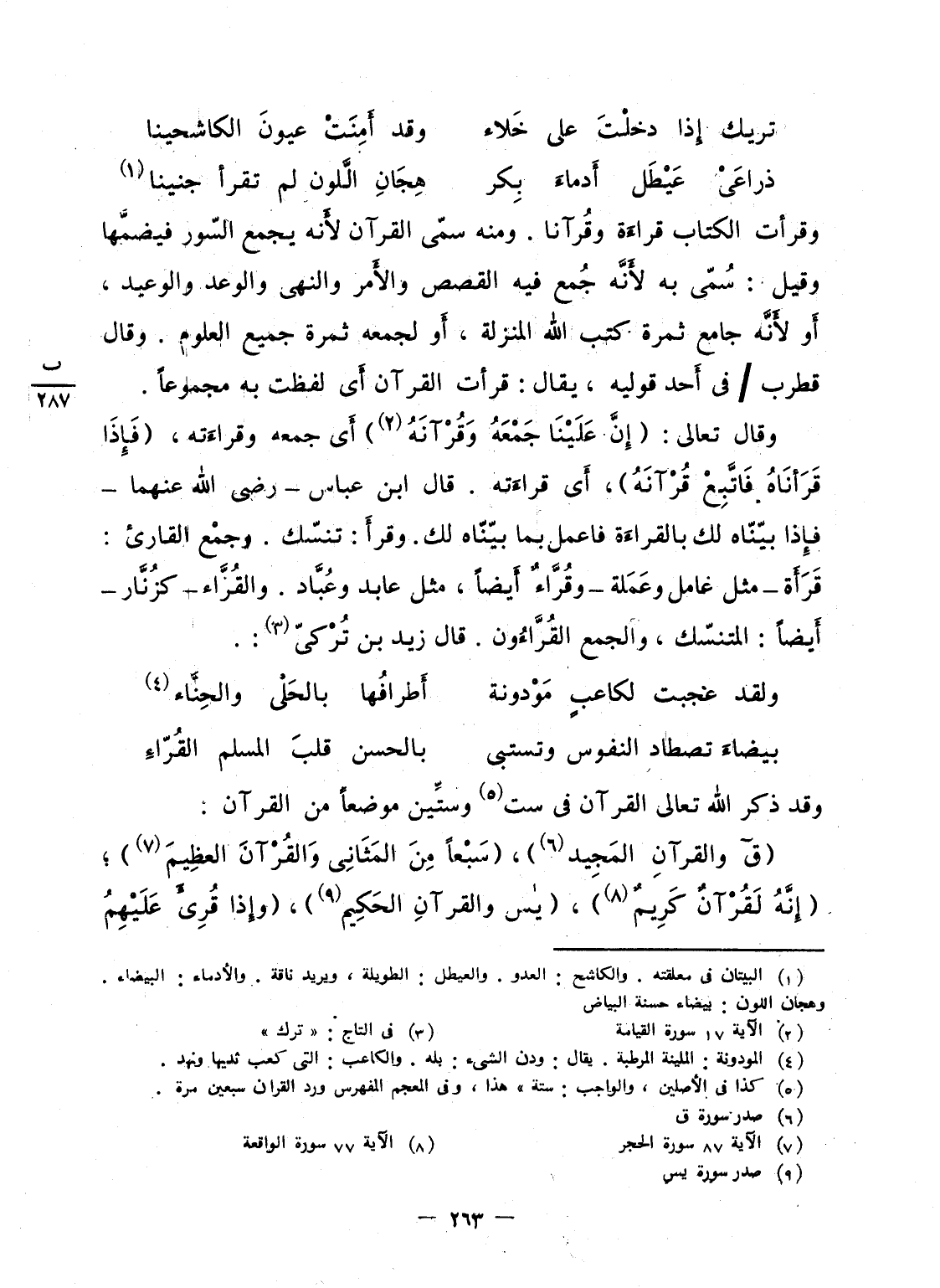 وقرأت الكتاب قراءَة وقُرآنا. ومنه سمّى القرآن لأَنه يجمع السّور فيضمَّها وقيل: سُمّى به لأَنَّه جُمع فيه القصص والأَمر والنهى والوعد والوعيد، أَو لأَنَّه جامع ثمرة كتب الله المنزلة، أَو لجمعه ثمرة جميع العلوم. وقال قطرب / فى أَحد قوليه، يقال: قرأت القرآن أَى لفظت به مجموعاً.