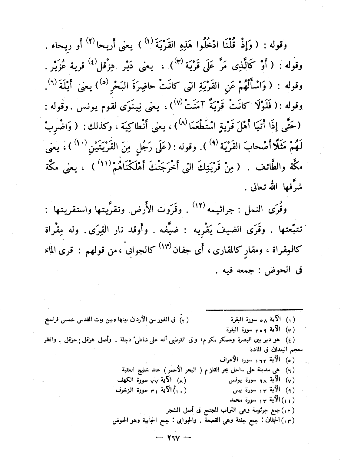 وقوله: {وَإِذْ قُلْنَا ادخلوا هاذه القرية} يعنى أَريحا أَو رِيحاء. وقوله: {أَوْ كالذي مَرَّ على قَرْيَةٍ} ، يعنى دَيْر هِزْقل قرية عُزَيْر. وقوله: {وَسْئَلْهُمْ عَنِ القرية التي كَانَتْ حَاضِرَةَ البحر} يعنى أَيْلَةَ. وقوله: {فَلَوْلاَ كَانَتْ قَرْيَةٌ آمَنَتْ} ، يعنى نِينَوَى لقوم يونس. وقوله: {حتى إِذَآ أَتَيَآ أَهْلَ قَرْيَةٍ استطعمآ} ، يعنى أَنْطاكِيَة، وكذلك: {واضرب لَهُمْ مَّثَلاً أَصْحَابَ القرية} . وقوله: {على رَجُلٍ مِّنَ القريتين} ، يعنى مكَّة والطَّائف. {مِّن قَرْيَتِكَ التي أَخْرَجَتْكَ أَهْلَكْنَاهُمْ} ، يعنى مكَّة شرَّفها الله تعالى.