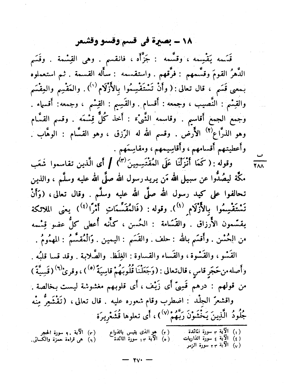 وقوله: {كَمَآ أَنْزَلْنَا عَلَى المقتسمين} / أَى الَّذين تقاسموا شعَب مكَّة ليصُدُّوا عن سبيل الله مَن يريد رسول الله صلَّى الله عليه وسلَّم، والذين تحالفوا على كيد رسول الله صلَّى الله عليه وسلَّم. وقال تعالى، {وَأَنْ تَسْتَقْسِمُواْ بالأزلام} . وقوله: {فالمقسمات أَمْراً} يعنى الملائكة يقسّمون الأَرزاق. والقَسَامة: الحُسن، كأَنه أُعطى كلُّ عضو قِسْمه من الحُسْن. وأَقَسم بالله: حلف. والقَسَم: اليمين. وَالْمُقسَّمُ: المهمُومُ.