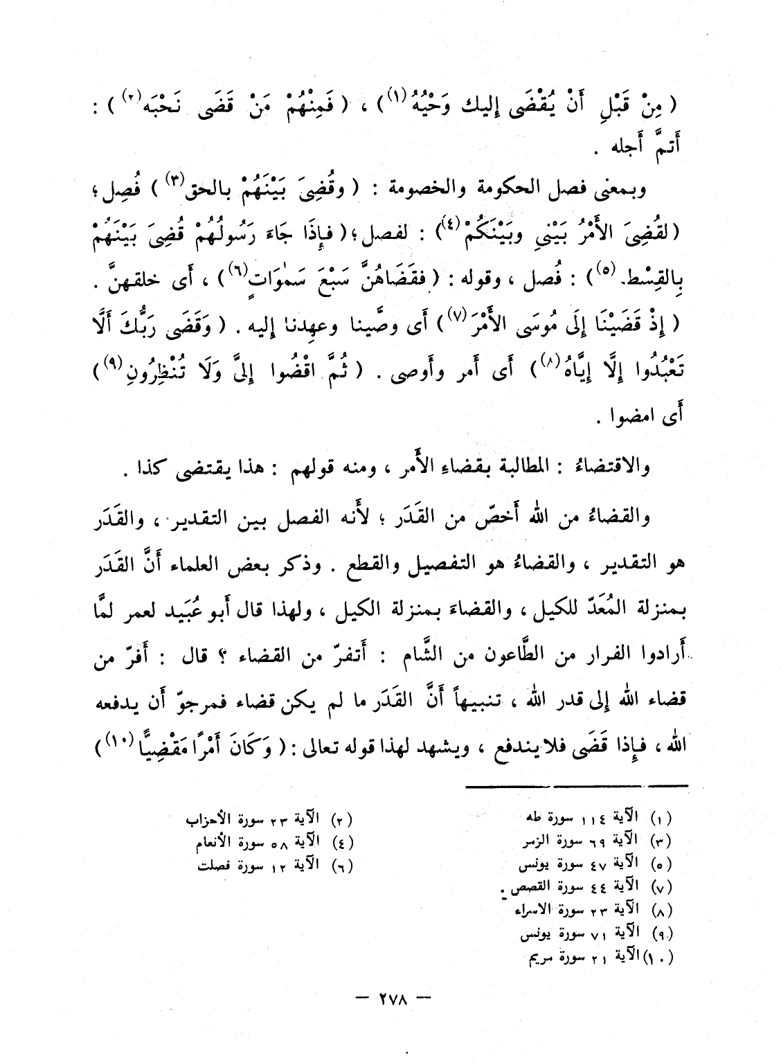 وبمعنى فصل الحكومة والخصومة: {وَقُضِيَ بَيْنَهُم بالحق} فُصِل {لَقُضِيَ الأمر بَيْنِي وَبَيْنَكُمْ} : لفصل؛ {فَإِذَا جَآءَ رَسُولُهُمْ قُضِيَ بَيْنَهُمْ بالقسط} : فُصل، وقوله: {فَقَضَاهُنَّ سَبْعَ سَمَاوَاتٍ} ، أَى خلقهنَّ. {إِذْ قَضَيْنَآ إلى مُوسَى الأمر} أَى وصَّينا وعهِدنا إِليه. {وقضى رَبُّكَ أَلاَّ تعبدوا إِلاَّ إِيَّاهُ} أَى أَمر وأَوصى. {ثُمَّ اقضوا إِلَيَّ وَلاَ تُنظِرُونَ} أَى امضوا.