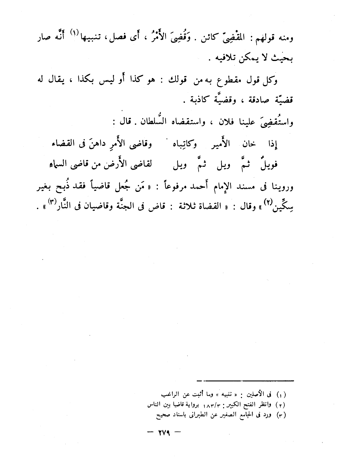 وروينا فى مسند الإِمام أَحمد مرفوعاً: "مَن جُعل قاضياً فقد ذُبح بغير سِكِّين" وقال: "القضاة ثلاثة: قاض فى الجنَّة وقاضيان فى النَّار".