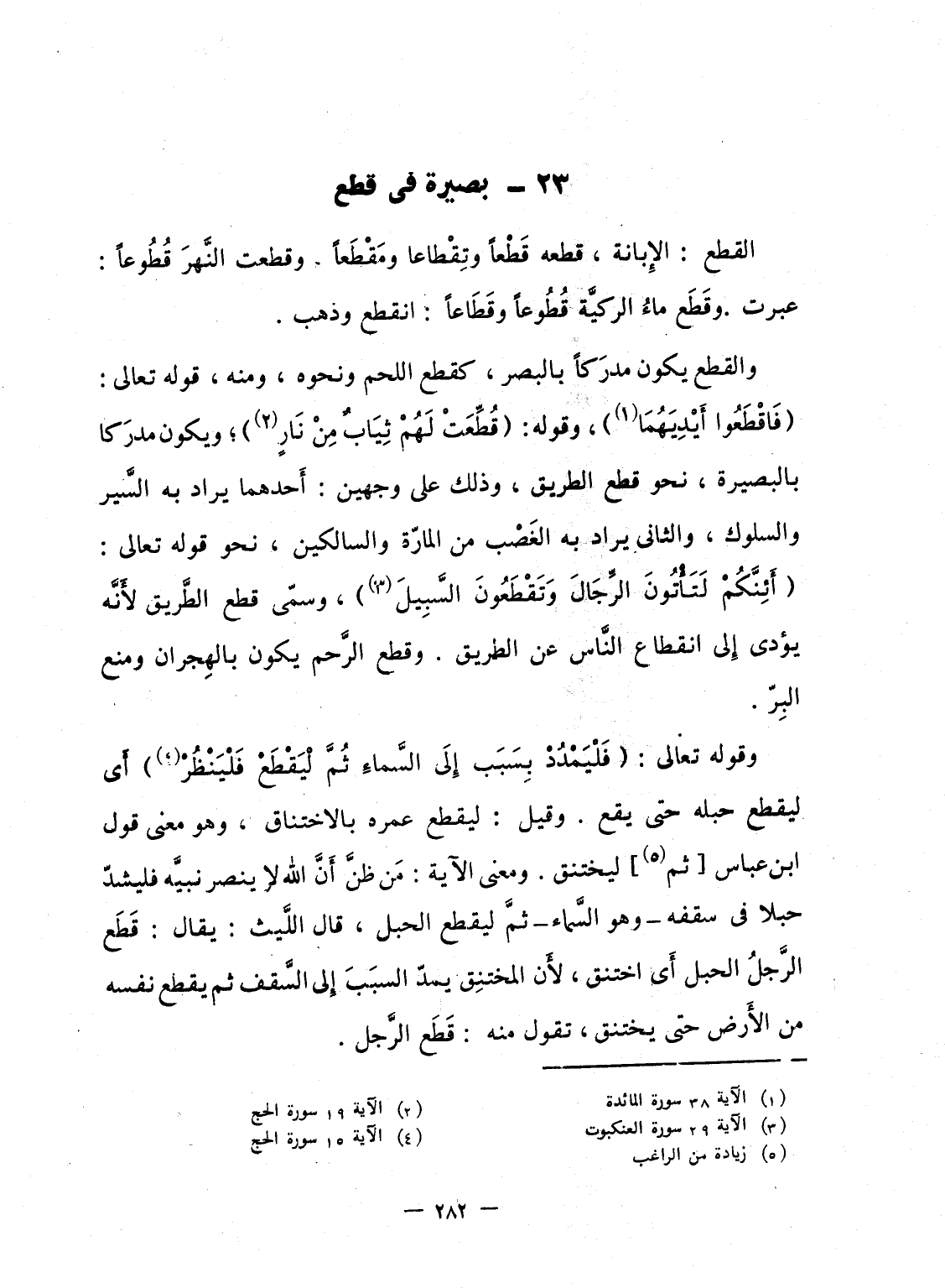 والقطع يكون مدرَكاً بالبصر، كقطع اللحم ونحوه، ومنه، قوله تعالى: {فاقطعوا أَيْدِيَهُمَا} ، وقوله: {قُطِّعَتْ لَهُمْ ثِيَابٌ مِّن نَّارِ} ؛ ويكون مدرَكا بالبصيرة، نحو قطع الطريق، وذلك على وجهين: أَحدهما يراد به السَّير والسلوك، والثانى يراد به الغَصْب من المارّة والسالكين، نحو قوله تعالى: {أَئِنَّكُمْ لَتَأْتُونَ الرجال وَتَقْطَعُونَ السبيل} ، وسمّى قطع الطَّريق لأَنَّه يؤدى إِلى انقطاع النَّاس عن الطريق. وقطع الرَّحم يكون بالهِجران ومنع البِرّ.