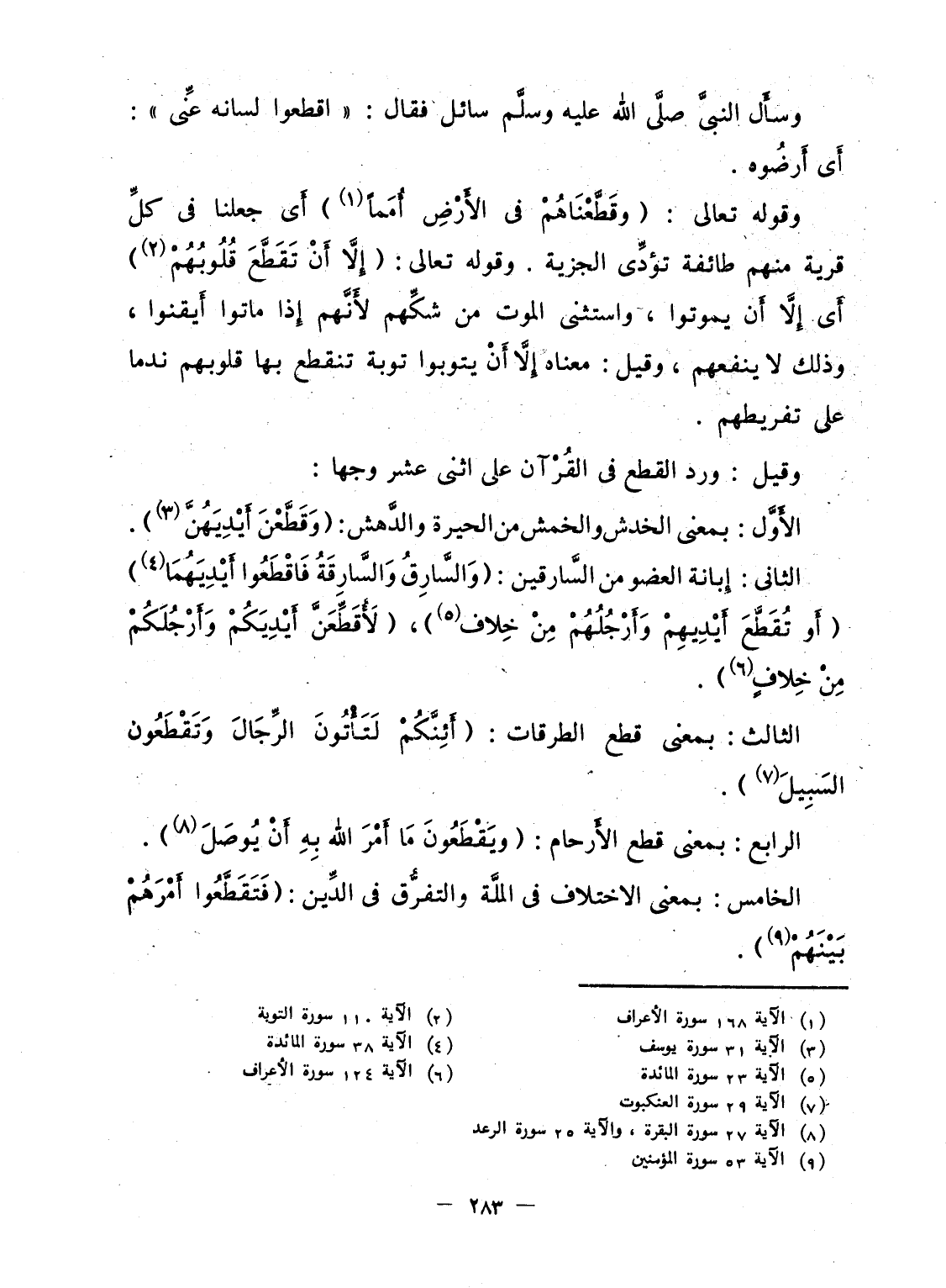 وقيل: ورد القطع فى القُرْآن على اثنى عشر وجها: