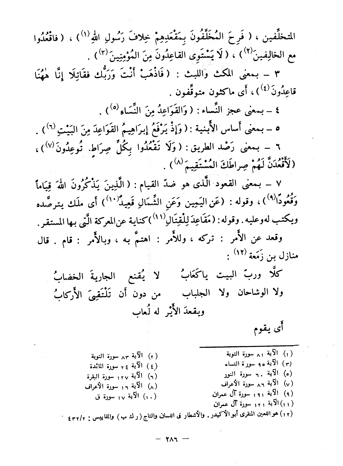 7- بمعنى القعود الَّذى هو ضدّ القيام: {الذين يَذْكُرُونَ الله قِيَاماً وَقُعُوداً} ، وقوله: {عَنِ اليمين وَعَنِ الشمال قَعِيدٌ} أَى ملَك يترصَّده ويكتب له وعليه. وقوله {مَقَاعِدَ لِلْقِتَالِ} كناية عن المعركة الَّتى بها المستقر.