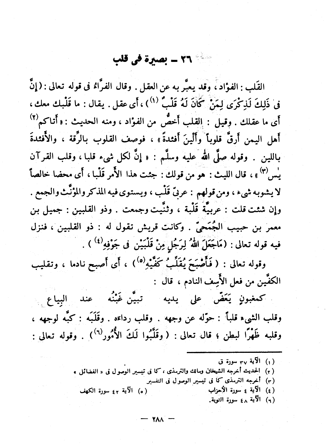 القَلب: الفؤاد، وقد يعبَّر به عن العقل. وقال الفرَّاءُ فى قوله تعالى: {إِنَّ فِي ذَلِكَ لذكرى لِمَن كَانَ لَهُ قَلْبٌ} ، أَى عقل. يقال: ما قَلْبك معك، أَى ما عقلك. وقيل: القلب أَخصُّ من الفؤاد، ومنه الحديث: "أَتاكم أَهل اليمن أَرقَّ قلوباً وأَلْينَ أَفئدةً"، فوصف القلوب بالرِّقة، والأَفئدةَ باللين. وقوله صلَّى الله عليه وسلَّم: "إِنَّ لكل شىء قلبا، وقلب القرآن يس"، قال الليث: هو من قولك: جئت هذا الأَمر قَلْبا، أَى محضا خالصاً لا يشوبه شىء، ومن قولهم: عربىّ قَلْب، ويستوى فيه المذكر والمؤنَّث والجمع. وإِن شئت قلت: عربيَّة قَلْبة، وثنَّيت وجمعت. وذو القلبين: جميل بن معمر بن حبيب الجُمَحىّ. وكانت قريش تقوم له: ذو القلبين، فنزل فيه قوله تعالى: {مَّا جَعَلَ الله لِرَجُلٍ مِّن قَلْبَيْنِ فِي جَوْفِهِ} .