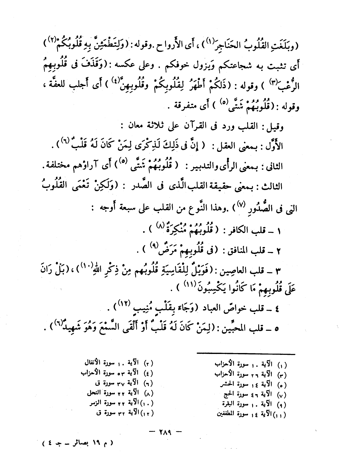 {وَبَلَغَتِ القلوب الحناجر} ، أَى الأَرواح. وقوله: {وَلِتَطْمَئِنَّ بِهِ قُلُوبُكُمْ} أَى تثبت به شجاعتكم وَيزول خوفكم. وعلى عكسه: {وَقَذَفَ فِي قُلُوبِهِمُ الرعب} وقوله: {ذلكم أَطْهَرُ لِقُلُوبِكُمْ وَقُلُوبِهِنَّ} أَى أَجلب للعفَّة، وقوله: {قُلُوبُهُمْ شتى} أَى متفرقة.