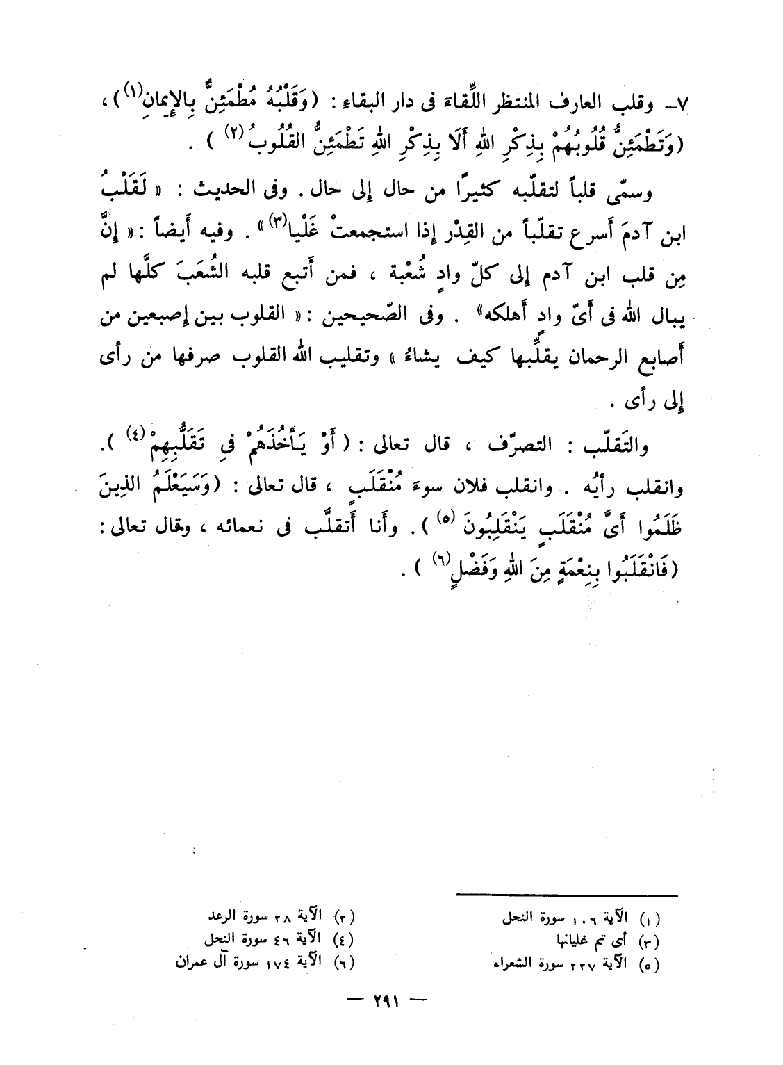 وسمّى قلباً لتقلّبه كثيرًا من حال إِلى حال. وفى الحديث: "لَقَلْبُ ابن آدمَ أَسرع تقلّباً من القِدْر إِذا استجمعتْ غَلْيا". وفيه أَيضاً: "إِنَّ مِن قلب ابن آدم إِلى كلّ وادٍ شُعْبة، فمن أَتبع قلبه الشُعَبَ كلَّها لم يبال الله فى أَىّ وادٍ أَهلكه". وفى الصّحيحين: "القلوب بين إِصبعين من أَصابع الرحمان يقلِّبها كيف يشاءُ" وتقليب الله القلوب صرفها من رأى إِلى رأى.