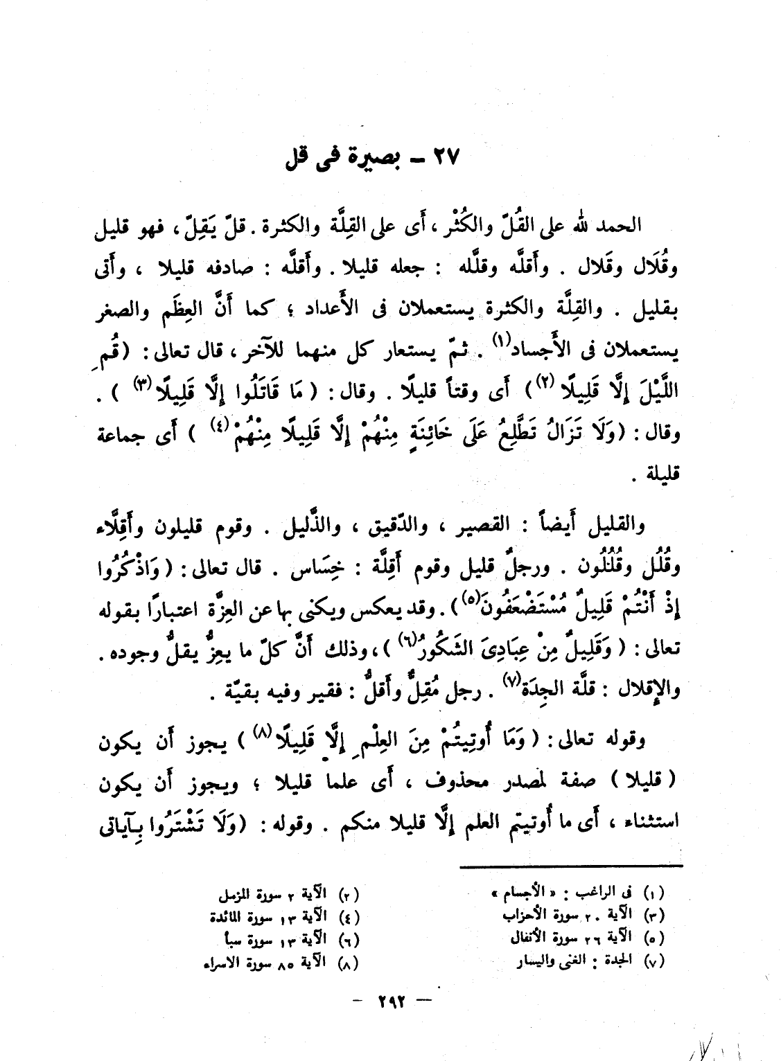 الحمد لله على القُلّ والكُثْر، أَى على القِلَّى والكثرة. قلّ يَقِلّ، فهو قليل وقُلاَل وقَلال. وأَقلَّه وقلَّله: جعله قليلا. وأَقلَّه: صادفه قليلا، وأَتى بقليل. والقِلَّة والكثرة يستعملان فى الأَعداد؛ كما أَنَّ العِظَم والصغر يستعملان فى الأَجساد. ثمّ يستعار كل منهما للآخر، قال تعالى: {قُمِ الليل إِلاَّ قَلِيلاً} أَى وقتاً قليلاً. وقال: {مَّا قاتلوا إِلاَّ قَلِيلاً} . وقال: {وَلاَ تَزَالُ تَطَّلِعُ على خَآئِنَةٍ مِّنْهُمْ إِلاَّ قَلِيلاً مِّنْهُمُ} أَى جماعة قليلة.