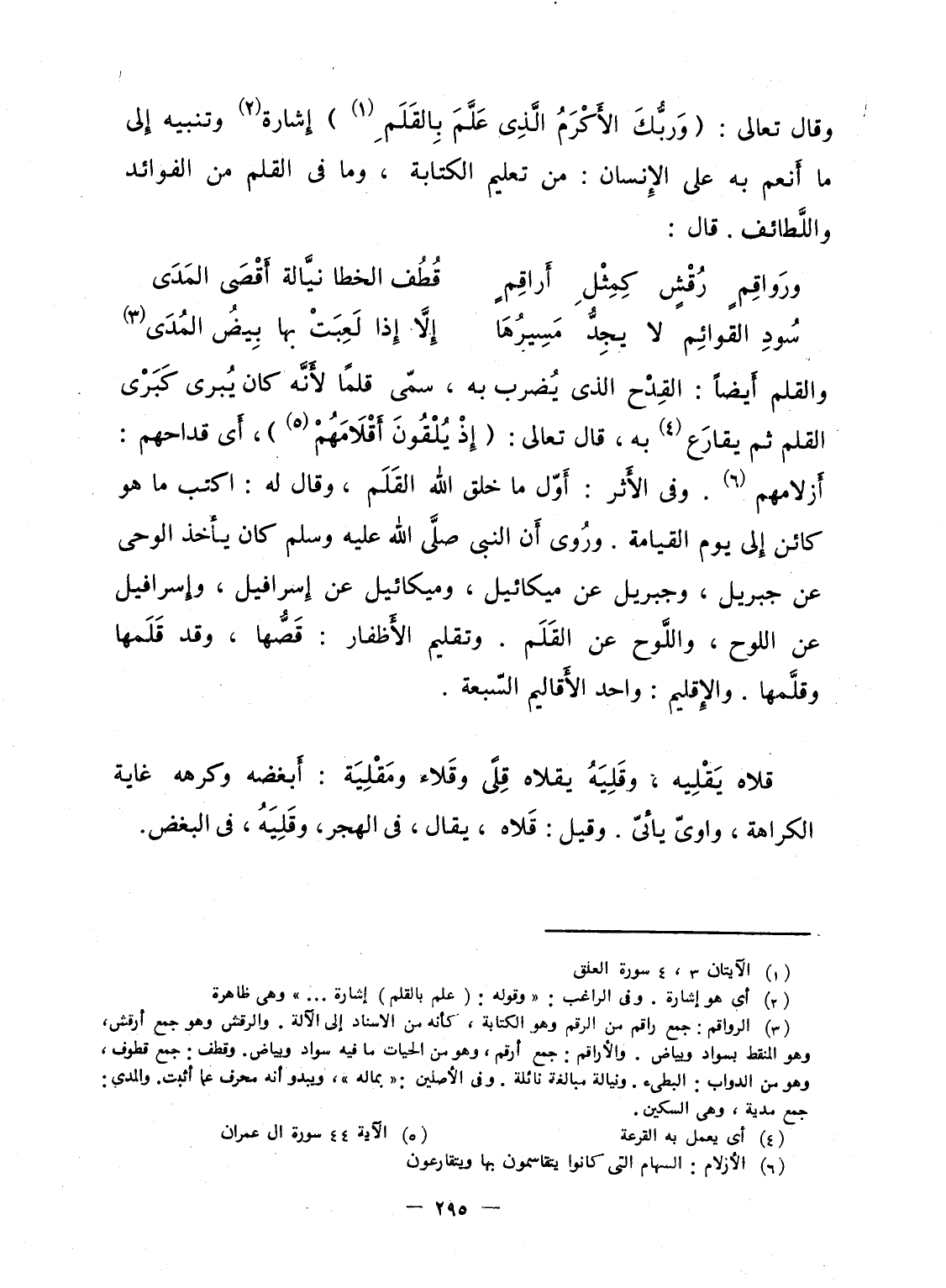 والقلم أَيضاً: القِدْح الذى يُضرب به، سمّى قلمًا لأَنَّه كان يُبرى كَبَرْى القلم ثم يقارَع به، قال تعالى: {إِذْ يُلْقُون أَقْلاَمَهُمْ} ، أَى قداحهم: أَزلامهم. وفى الأَثر: أَوّل ما خلق الله القَلَم، وقال له: اكتب ما هو كائن إِلى يوم القيامة. ورُوى أَن النبى صلَّى الله عليه وسلم كان يأخذ الوحى عن جبريل، وجبريل عن ميكائيل، وميكائيل عن إِسرافيل، وإِسرافيل عن اللوح، واللَّوح عن القَلَم. وتقليم الأَظافر: قَصُّها، وقد قَلَمها وقلَّمها. والإِقليم: واحد الأَقاليم السّبعة.