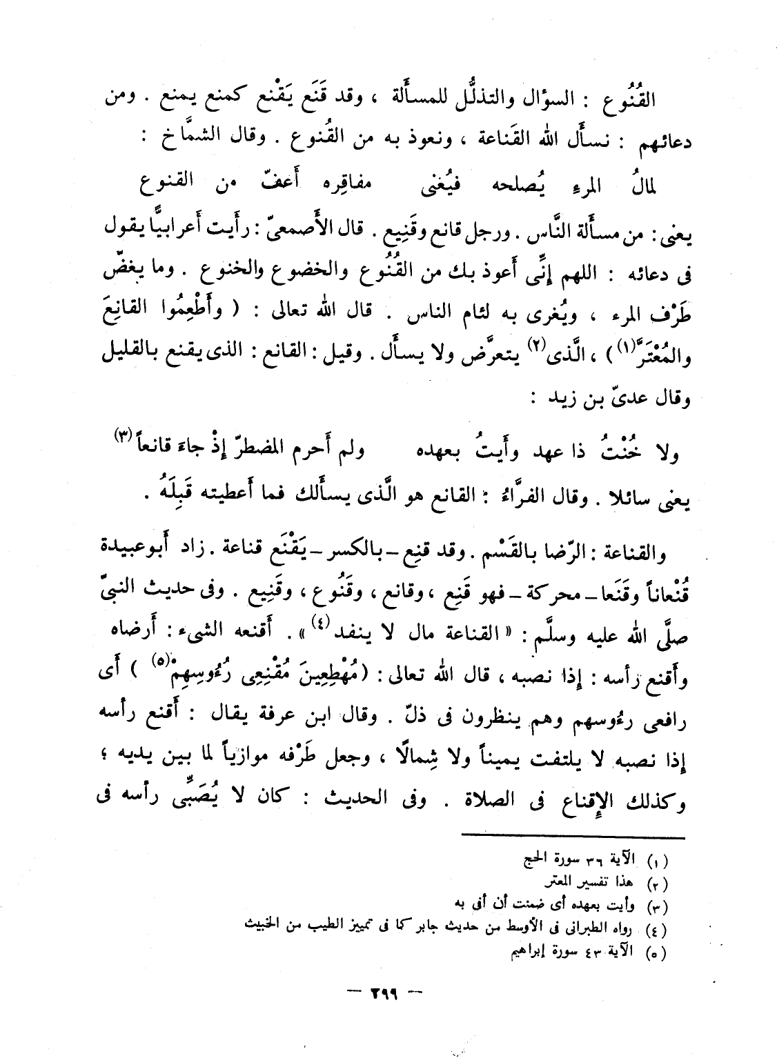 يعنى: من مسأَلة النَّاس. ورجل قانع وقَنِيع. قال الأَصمعىّ: رأَيت أَعرابيًّا يقول فى دعائه: اللهم إِنِّى أَعوذ بك من القُنُوع والخضوع والخنوع. وما يغضّ طَرْف المرء، ويُغرى به لئام الناس. قال الله تعالى: {وَأَطْعِمُواْ القانع والمعتر} ، الَّذى يتعرَّض ولا يسأَل. وقيل: القانع: الذى يقنع بالقليل وقال عدىّ بن زيد: