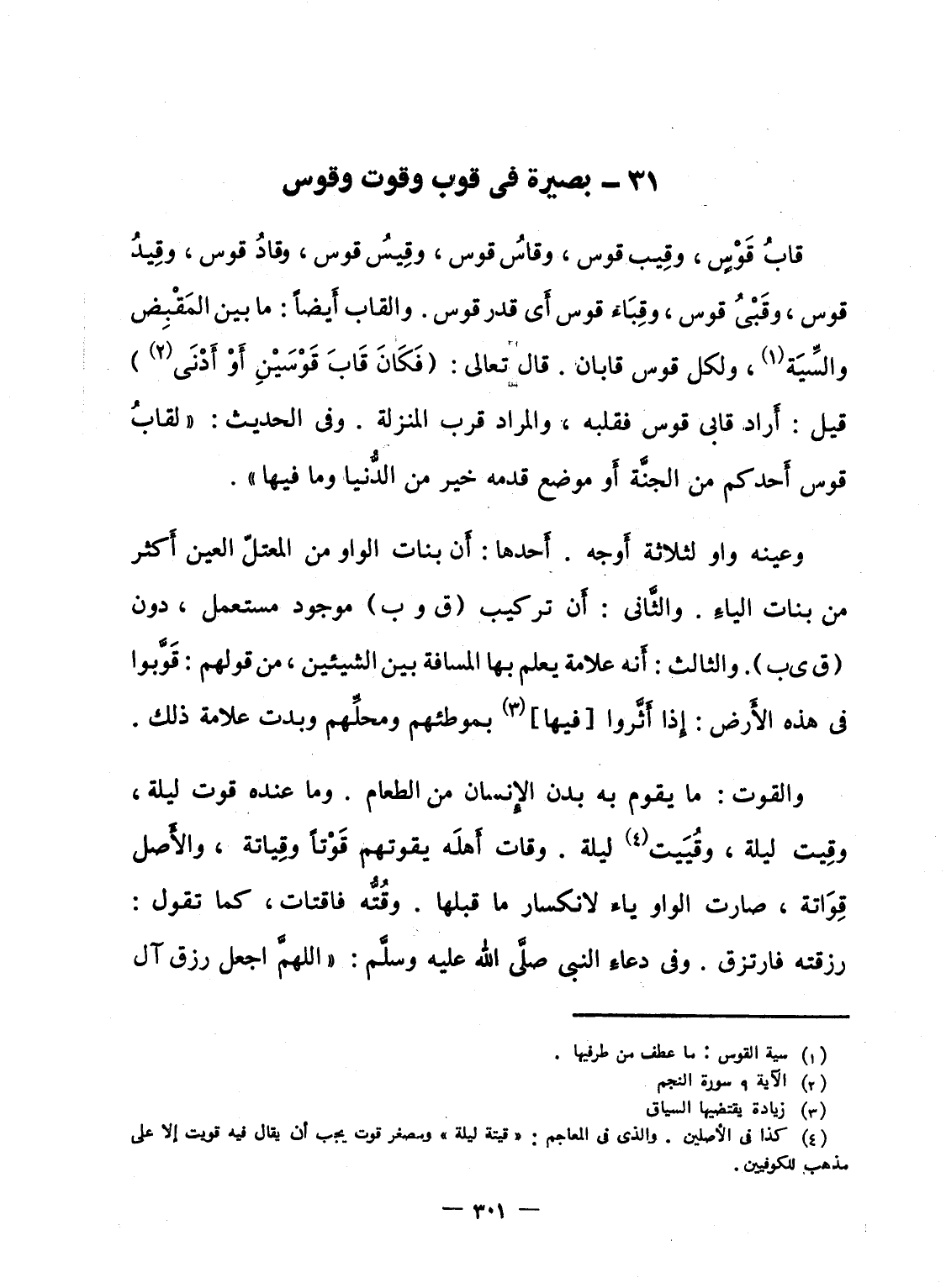 قابُ قَوْسٍ، وقِيب قوس، وقاسُ قوس، وقِيسُ قوس، وقادُ قوس، وقِيدُ قوس، وقَبْىُ قوس، وقِبَاء قوس أَى قدر قوس. والقاب أَيضاً: ما بين المَقْبِض والسِّيَة، ولكل قوس قابان. قال تعالى: {فَكَانَ قَابَ قَوْسَيْنِ أَوْ أدنى} قيل: أَراد قابى قوس فقلبه، والمراد قرب المنزلة. وفى الحديث: "لقابُ قوس أَحدكم من الجنَّة أَو موضع قدمه خير من الدُّنيا وما فيها".