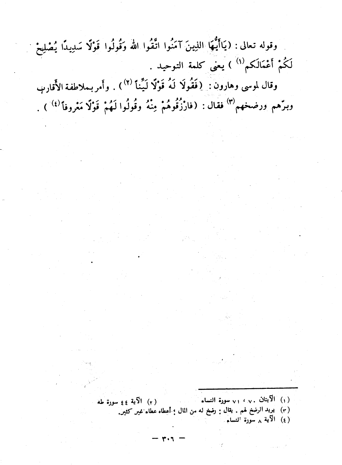 وقال لموسى وهارون: {فَقُولاَ لَهُ قَوْلاً لَّيِّناً} . وأَمر بملاطفة الأَقارب وبرّهم ورضخهم فقال: {فارزقوهم مِّنْهُ وَقُولُواْ لَهُمْ قَوْلاً مَّعْرُوفاً} .