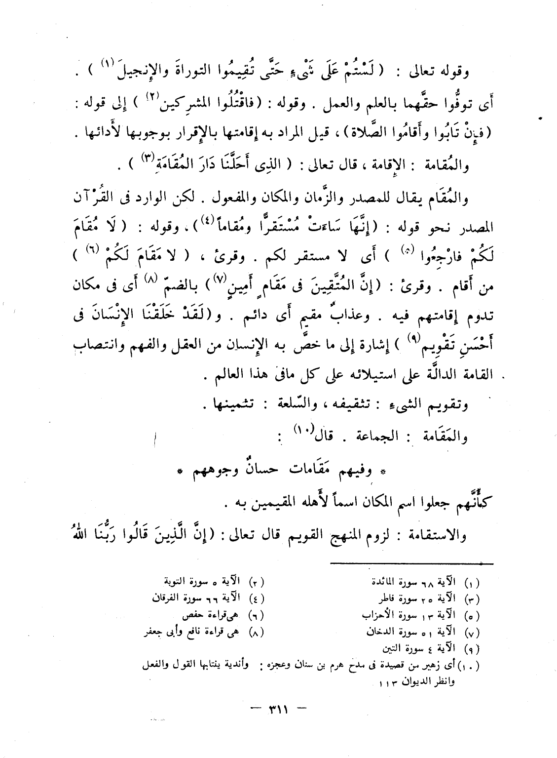 والمُقَام يقال للمصدر والزَّمان والمكان والمفعول. لكن الوارد فى القُرْآن المصدر نحو قوله: {إِنَّهَا سَآءَتْ مُسْتَقَرّاً وَمُقَاماً} ، وقوله: {لاَ مُقَامَ لَكُمْ فارجعوا} أَى لا مستقر لكم. وقرئ، {لا مَقَامَ لَكُمْ} من أَقام. وقرئ: {إِنَّ المتقين فِي مَقَامٍ أَمِينٍ} بالضمّ أَى فى مكان تدوم إِقامتهم فيه. وعذابٌ مقيم أَى دائم. و {لَقَدْ خَلَقْنَا الإنسان في أَحْسَنِ تَقْوِيمٍ} إِشارة إِلى ما خصَّ به الإِنسان من العقل والفهم وانتصاب القامة الدالَّة على استيلائه على كل ما فى هذا العالم.