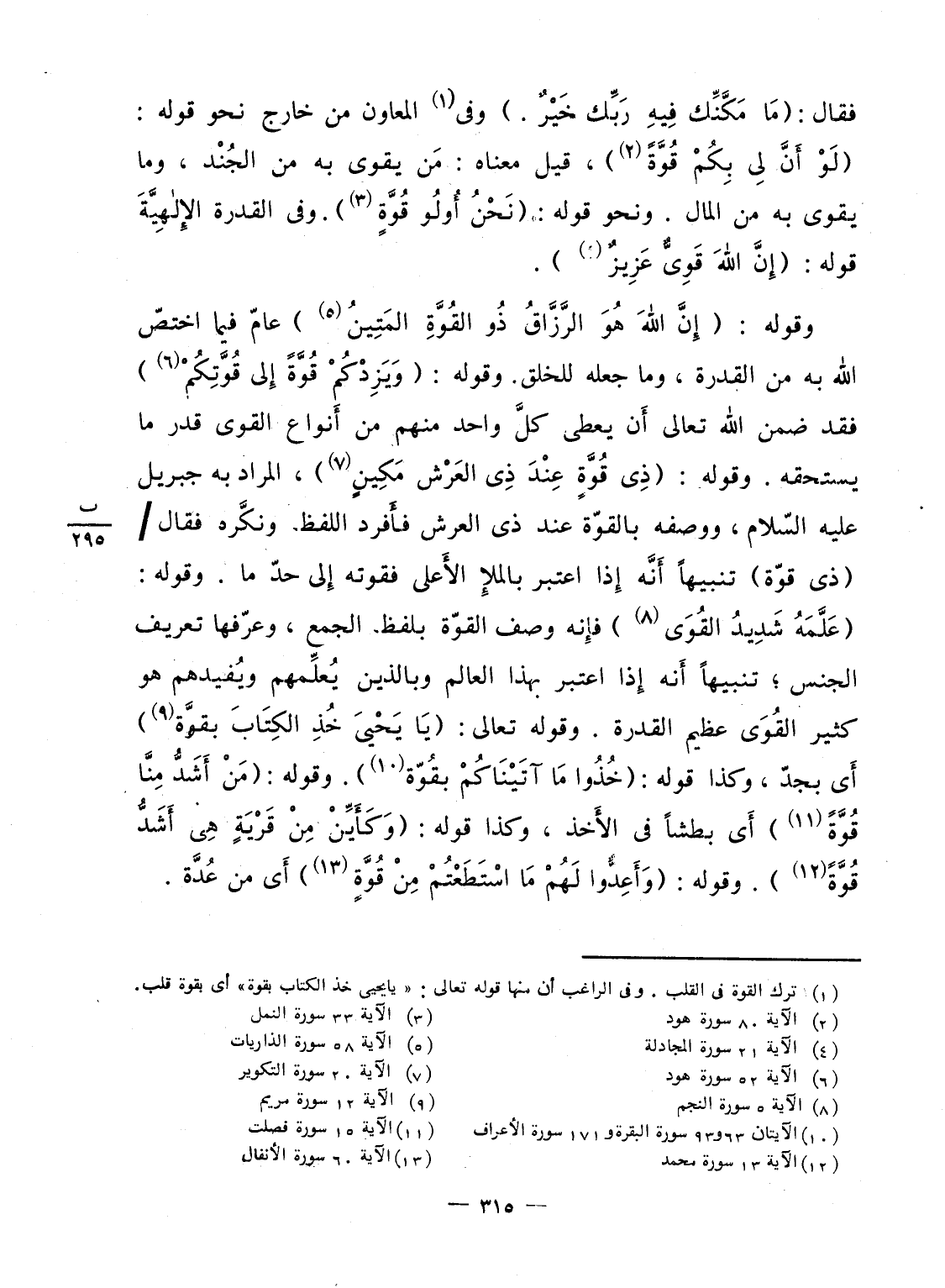وقوله: {إِنَّ الله هُوَ الرزاق ذُو القوة المتين} عامّ فيما اختصّ الله به من القدرة، وما جعله للخلق. وقوله: {وَيَزِدْكُمْ قُوَّةً إلى قُوَّتِكُمْ} فقد ضمن الله تعالى أَن يعطى كلَّ واحد منهم من أَنواع القوى قدر ما يستحقه. وقوله: {ذِي قُوَّةٍ عِندَ ذِي العرش مَكِينٍ} ، المراد به جبريل عليه السّلام، ووصفه بالقوّة عند ذى العرش فأَفرد اللفظ ونكَّره فقال / (ذى قوّة) تنبيهاً أَنَّه إِذا اعتبر بالملإِ الأَعلى فقوته إِلى حدّ ما. وقوله: {عَلَّمَهُ شَدِيدُ القوى} فإِنه وصف القوّة بلفظ الجمع، وعرّفها تعريف الجنس؛ تنبيهاً أَنه إِذا اعتبر بهذا العالم وبالذين يُعلِّمهم ويُفيدهم هو كثير القُوّى عظيم القدرة. وقوله تعالى: {يايحيى خُذِ الكتاب بِقُوَّةٍ} أَى بجدّ، وكذا قوله: {خُذُواْ مَآ ءاتيناكم بِقُوَّةٍ} . وقوله: {مَنْ أَشَدُّ مِنَّا قُوَّةً} أَى بطشاً فى الأَخذ، وكذا قوله: {وَكَأَيِّن مِّن قَرْيَةٍ هِيَ أَشَدُّ قُوَّةً} . وقوله: {وَأَعِدُّواْ لَهُمْ مَّا استطعتم مِّن قُوَّةٍ} أَى من عُدَّة.