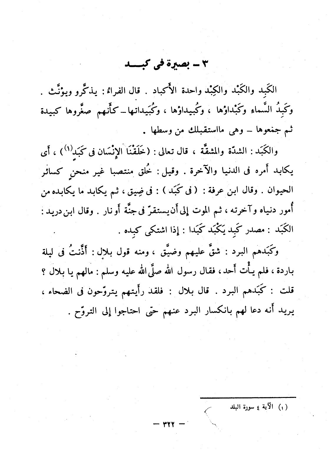 والكَبَد: الشدّة والمشقَّة، قال تعالى: {خَلَقْنَا الإنسان فِي كَبَدٍ} ، أَى يكابد أَمره فى الدنيا والآخرة. وقيل: خُلق منتصبا غير منحنٍ كسائر الحيوان. وقال ابن عرفة: (فى كَبَد) : فى ضِيق، ثم يكابد ما يكابده من أُمور دنياه وآخرته، ثم الموت إِلى أَن يستقرّ فى جنَّة أَو نار. وقال ابن دريد: الكَبَد: مصدر كَبِد يَكْبَد كَبَدا: إِذا اشتكى كبِده.