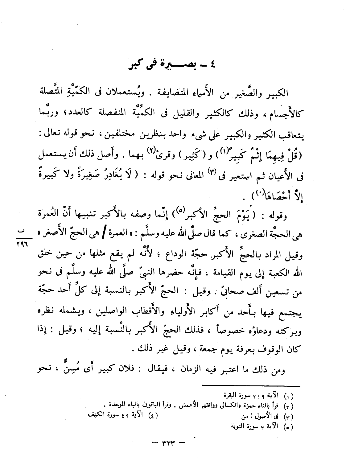 الكبير والصَّغير من الأَسماءِ المتضايفة. ويُستعملان فى الكمّيَّةِ المتَّصلة كالأَجسام، وذلك كالكثير والقليل فى الكمِّيَّة المنفصلة كالعدد؛ وربَّما يتعاقب الكثير والكبير على شىء واحد بنظرين مختلفين، نحو قوله تعالى: {قُلْ فِيهِمَآ إِثْمٌ كَبِيرٌ} و (كَثِير) وقرئ بهما. وأَصل ذلك أَن يستعمل فى الأَعيان ثم استعير فى المعانى نحو قوله: {لاَ يُغَادِرُ صَغِيرَةً وَلاَ كَبِيرَةً إِلاَّ أَحْصَاهَا} .