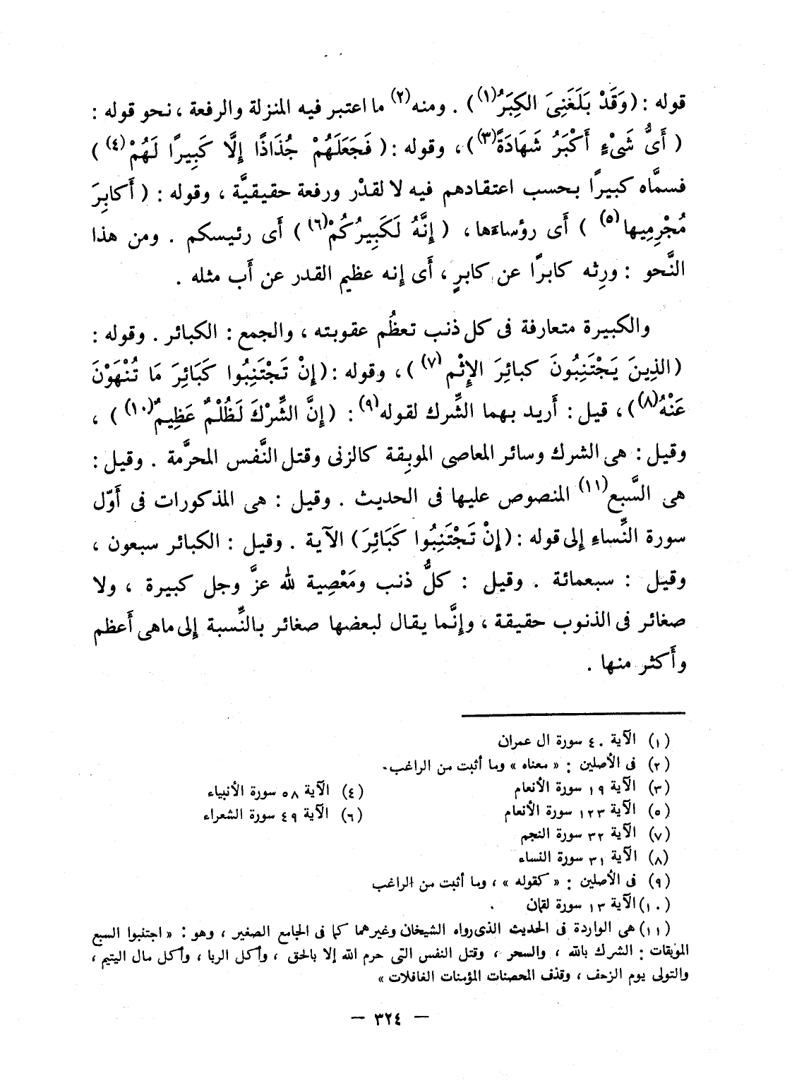 والكبيرة متعارفة فى كل ذنب تعظُم عقوبته، والجمع: الكبائر. وقوله: {الذين يَجْتَنِبُونَ كَبَائِرَ الإثم} ، وقوله: {إِن تَجْتَنِبُواْ كَبَآئِرَ مَا تُنْهَوْنَ عَنْهُ} ، قيل: أَريد بهما الشِّرك لقوله: {إِنَّ الشرك لَظُلْمٌ عَظِيمٌ} ، وقيل: هى الشرك وسائر المعاصى الموبِقة كالزنى وقتل النَّفس المحرَّمة. وقيل: هى السَّبع المنصوص عليها فى الحديث. وقيل: هى المذكورات فى أَوّل سورة النِّساءِ إِلى قوله: {إِن تَجْتَنِبُواْ كَبَآئِرَ} الآية. وقيل: الكبائر سبعون، وقيل: سبعمائة. وقيل: كلُّ ذنب ومَعْصِية لله عزَّ وجل كبيرة، ولا صغائر فى الذنوب حقيقة، وإِنَّما يقال لبعضها صغائر بالنِّسبة إِلى ما هى أَعظم وأَكثر منها.