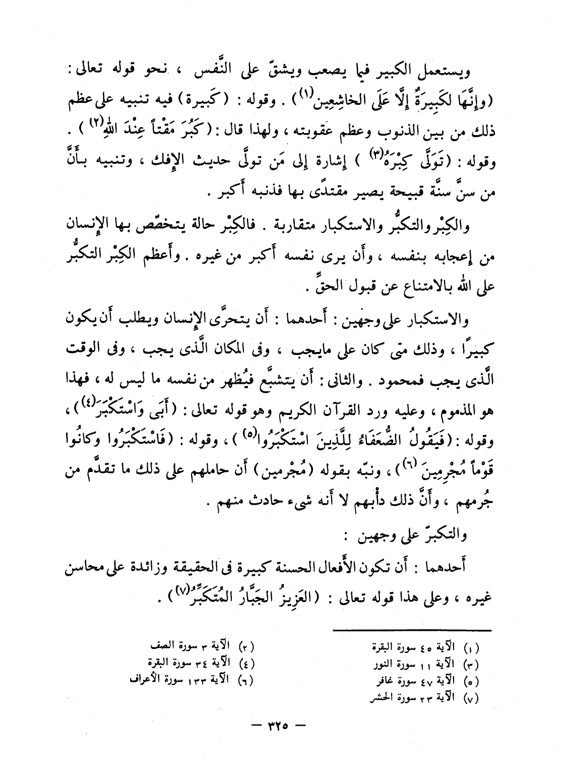 والاستكبار على وجهين: أَحدهما: أَن يتحرَّى الإِنسان ويطلب أَن يكون كبيرًا، وذلك متى كان على ما يجب، وفى المكان الَّذى يجب، وفى الوقت الَّذى يجب فمحمود. والثانى: أَن يتشبَّع فيُظهر من نفسه ما ليس له، فهذا هو المذموم، وعليه ورد القرآن الكريم وهو قوله تعالى: {أبى واستكبر} ، وقوله: {فَيَقُولُ الضعفاء لِلَّذِينَ استكبروا} ، وقوله: {فاستكبروا وَكَانُواْ قَوْماً مُّجْرِمِينَ} ، ونبّه بقوله (مُجْرمين) أَن حاملهم على ذلك ما تقدَّم من جُرمهم، وأَنَّ ذلك دأْبهم لا أَنه شىء حادث منهم.