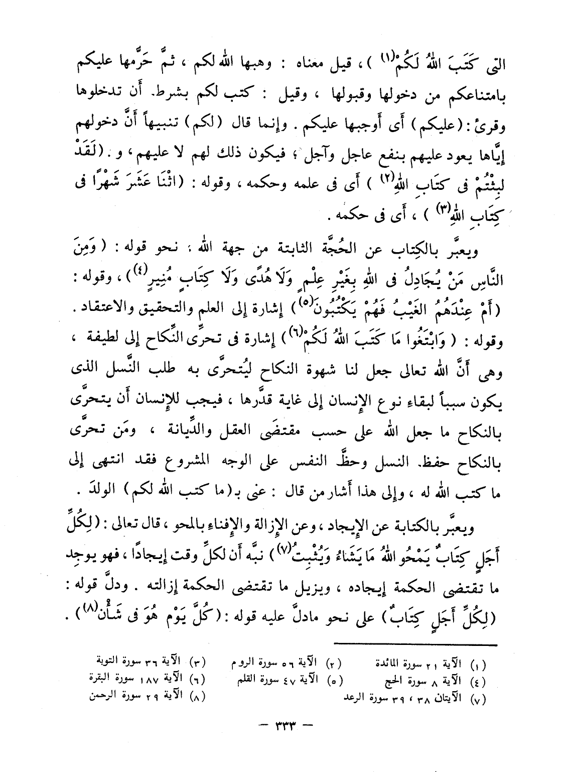 ويعبَّر بالكِتاب عن الحُجَّة الثابتة من جهة الله، نحو قوله: {ومِنَ الناس مَن يُجَادِلُ فِي الله بِغَيْرِ عِلْمٍ وَلاَ هُدًى وَلاَ كِتَابٍ مُّنِيرٍ} ، وقوله: {أَمْ عِندَهُمُ الغيب فَهُمْ يَكْتُبُونَ} إِشارة إِلى العلم والتحقيق والاعتقاد. وقوله: {وابتغوا مَا كَتَبَ الله لَكُمْ} إِشارة فى تحرِّى النِّكاح إِلى لطيفة، وهى أَنَّ الله تعالى جعل لنا شهوة النكاح ليُتحرَّى به طلب النَّسل الذى يكون سبباً لبقاءِ نوع الإِنسان إِلى غاية قدَّرها، فيجب للإِنسان أَن يتحرَّى بالنكاح ما جعل الله على حسب مقتضَى العقل والدِّيانة، ومَن تحرَّى بالنكاح حفظ النسل وحظَّ النفس على الوجه المشروع فقد انتهى إِلى ما كتب الله له، وإِلى هذا أَشار من قال: عنى بـ (ما كتب الله لكم) الولدَ.