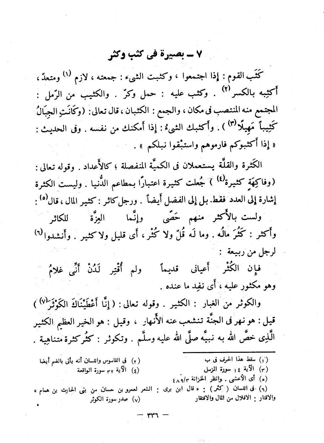الكَثرة والقلَّة يستعملان فى الكميَّة المنفصلة؛ كالأَعداد. وقوله تعالى: {وَفَاكِهَةٍ كَثِيرَةٍ} جُعلت كثيرة اعتباراً بمطاعم الدُّنيا. وليست الكثرة إِشارة إِلى العدد فقط بل إِلى الفضل أَيضاً. ورجل كاثر: كثير المال، قال:
