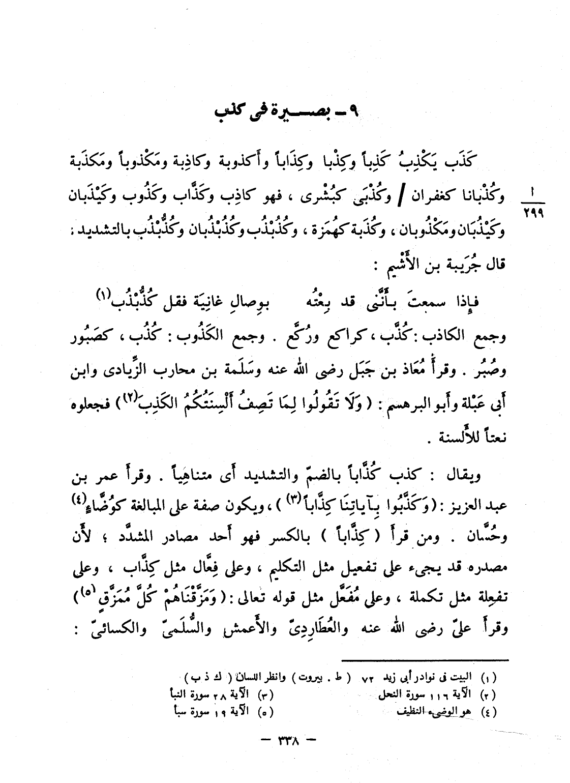 وجمع الكاذب: كُذَّب، كراكع ورُكَّع. وجمع الكَذُوب: كُذُب، كصَبُور وصُبُر. وقرأَ مُعَاذ بن جَبَل رضى الله عنه وسَلَمة بن محارب الزِّيادى وابن أَبى عَبْلة وأَبو البرهسم: {وَلاَ تَقُولُواْ لِمَا تَصِفُ أَلْسِنَتُكُمُ الكذب} فجعلوه نعتاً للأَلسنة.