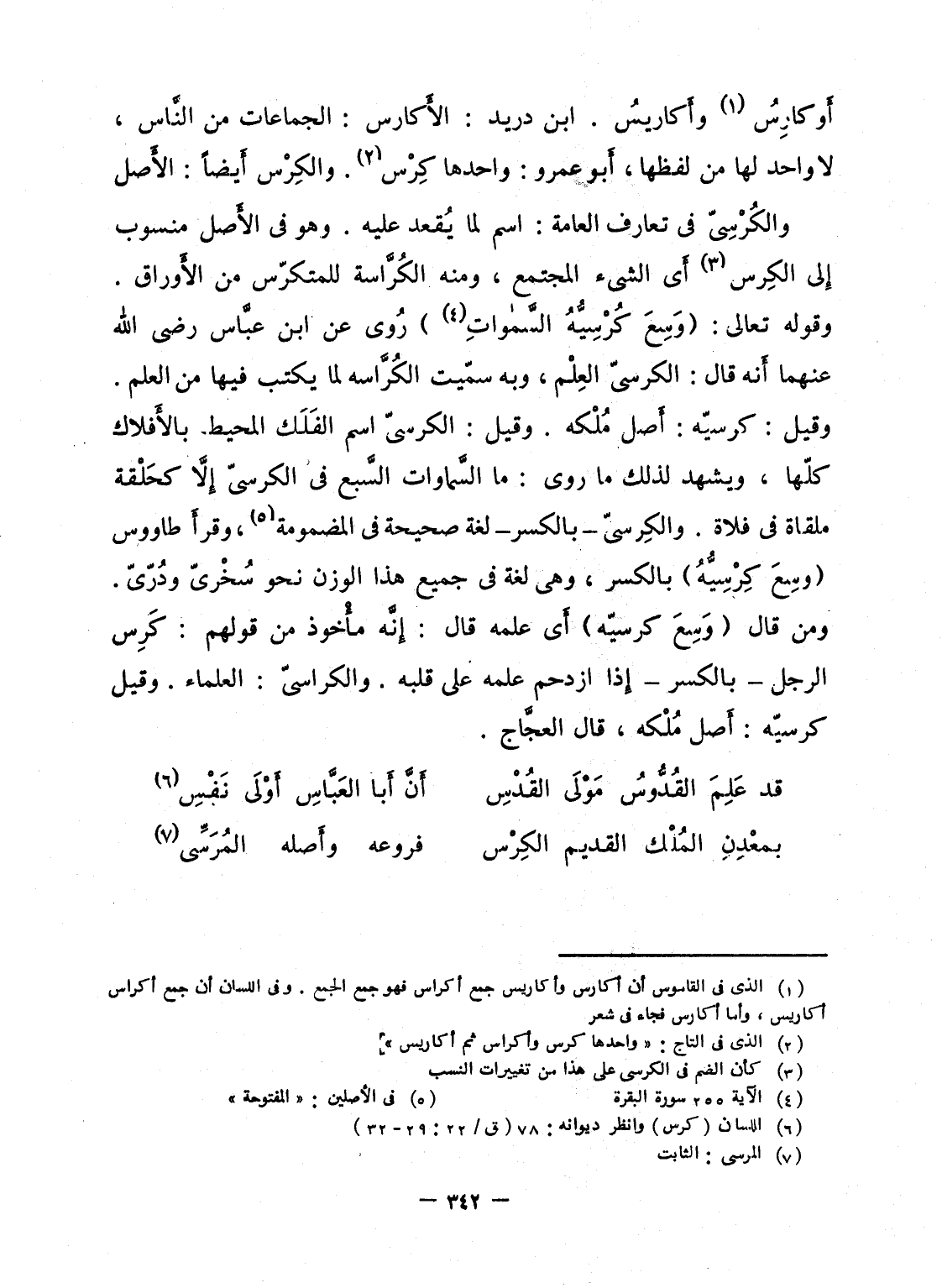 والكُرْسِىّ فى تعارف العامة: اسم لما يُقعد عليه. وهو فى الأَصل منسوب إِلى الكِرس أَى الشىء المجتمع، ومنه الكُرَّاسة للمتكرّس من الأَوراق. وقوله تعالى: {وَسِعَ كُرْسِيُّهُ السماوات} رُوى عن ابن عبَّاس رضى الله عنهما أَنه قال: الكرسىّ العِلْم، وبه سمّيت الكُرَّاسة لما يكتب فيها من العلم. وقيل: كرسيّه: أَصل مُلْكه. وقيل: الكرسىّ اسم الفَلَك المحيط بالأَفلاك كلّها، ويشهد لذلك ما روى: ما السَّماوات السَّبع فى الكرسىّ إِلاَّ كحَلْقة ملقاة فى فلاة. والكِرسىّ - بالكسر - لغة صحيحة فى المضمومة، وقرأَ طاووس {وسِعَ كِرْسِيُّهُ} بالكسر، وهى لغة فى جميع هذا الوزن نحو سُخْرىّ ودُرّىّ. ومن قال {وَسِعَ كرسيّه} أَى علمه قال: إِنَّه مأْخوذ من قولهم: كَرِس الرجل - بالكسر - إِذا ازدحم علمه على قلبه. والكراسىّ: العلماء. وقيل كرسيّه: أَصل مُلْكه، قال العجَّاج.
