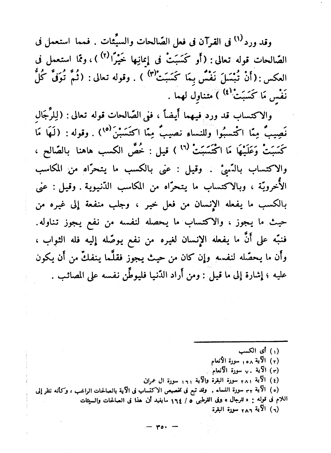 وقد ورد فى القرآن فى فعل الصّالحات والسيِّئات. فمما استعمل فى الصّالحات قوله تعالى: {أَوْ كَسَبَتْ في إِيمَانِهَا خَيْراً} ، وممّا استعمل فى العكس: {أَن تُبْسَلَ نَفْسٌ بِمَا كَسَبَتْ} . وقوله تعالى: {ثُمَّ توفى كُلُّ نَفْسٍ مَّا كَسَبَتْ} متناوِل لهما.