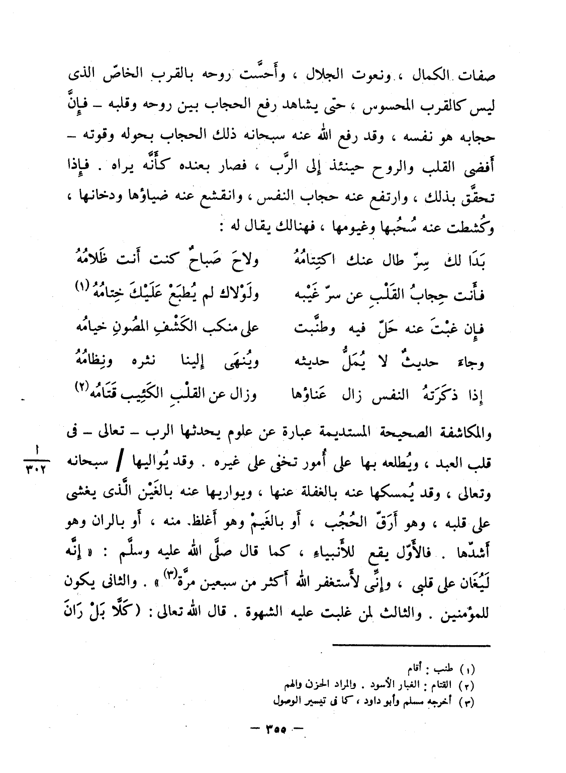 صفات الكمال، ونعوت الجلال، وأَحسَّت روحه بالقرب الخاصّ الذى ليس كالقرب المحسوس، حتى يشاهد رفع الحجاب بين روحه وقلبه - فإِنَّ حجابه هو نفسه، وقد رفع الله عنه سبحانه ذلك الحجاب بحوله وقوته - أَفضى القلب والروح حينئذ إِلى الرَّب، فصار بعنده كأَنَّه يراه. فإِذا تحقَّق بذلك، وارتفع عنه حجاب النفس، وانقشع عنه ضياؤها ودخانها، وكُشطت عنه سُحُبها وغيومها، فهنالك يقال له: