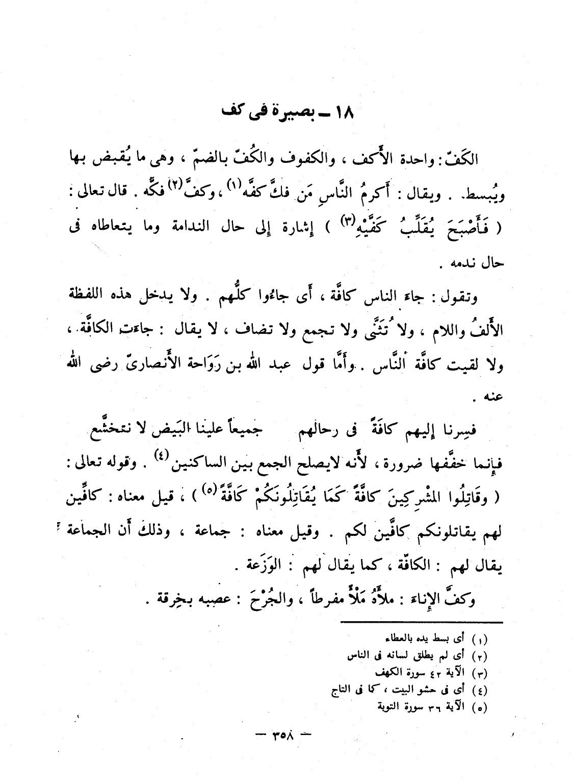 الكَفّ: واحدة الأَكف، والكفوف والكُفّ بالضمّ، وهى ما يُقبض بها ويُبسط. ويقال: أَكرم النَّاسِ مَن فكَّ كفَّه، وكفَّ فكَّه. قال تعالى: {فَأَصْبَحَ يُقَلِّبُ كَفَّيْهِ} إِشارة إِلى حال الندامة وما يتعاطاه فى حال ندمه.