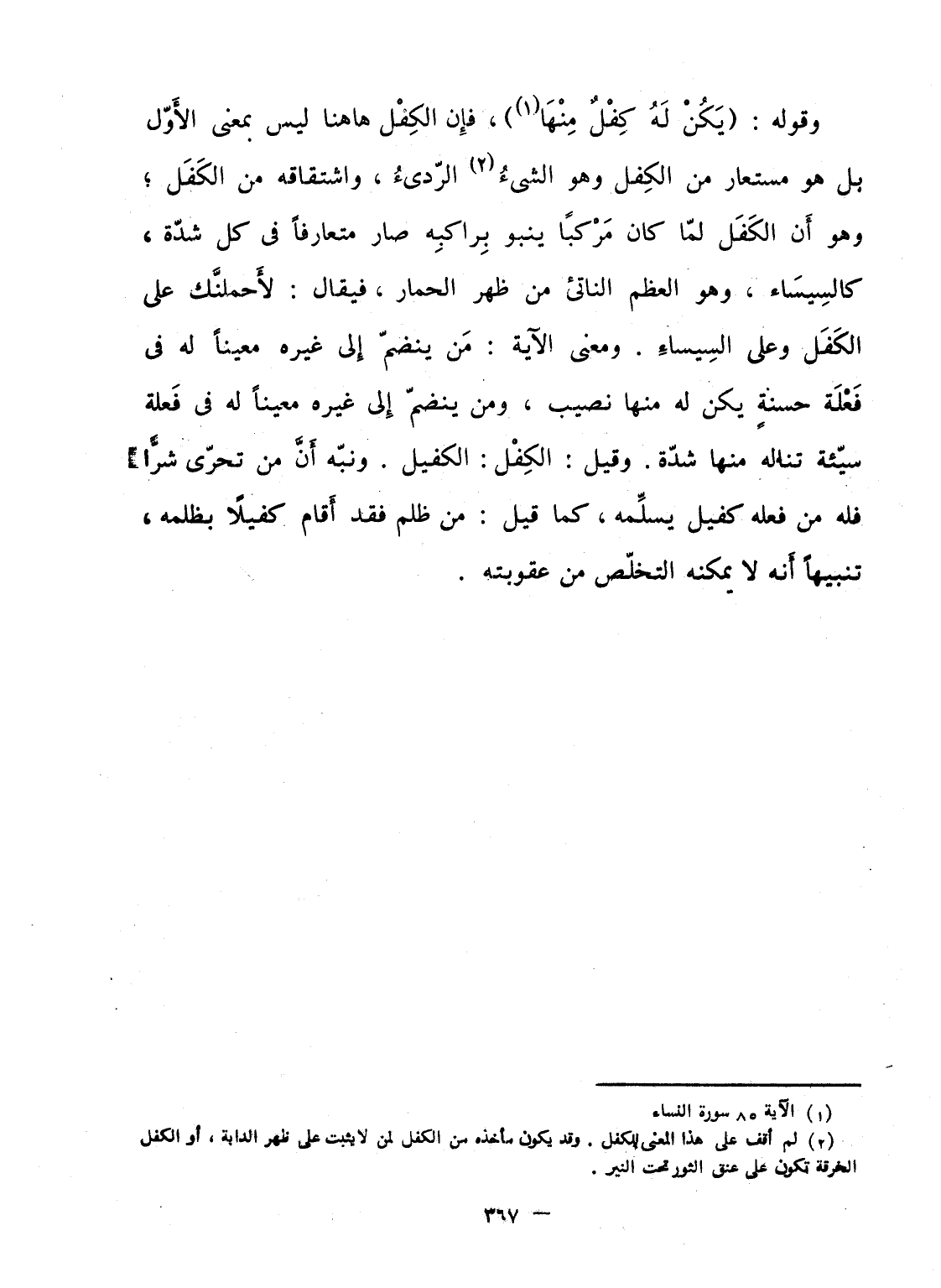 وقوله: {يَكُنْ لَّهُ كِفْلٌ مِّنْهَا} ، فإِن الكِفْل هاهنا ليس بمعنى الأَوّل بل هو مستعار من الكِفل وهو الشىءُ الرّدىءُ، واشتقاقه من الكَفَل؛ وهو أَن الكَفَل لمّا كان مَرْكبًا ينبو بِراكبِه صار متعارفاً فى كل شدّة، كالسِيسَاء، وهو العظم الناتئ من ظهر الحمار، فيقال: لأَحملنَّك على الكَفَل وعلى السِيساءِ. ومعنى الآية: مَن ينضمّ إِلى غيره معيناً له فى فَعْلَة حسنة يكن له منها نصيب، ومن ينضمّ إِلى غيره معيناً له فى فَعلة سيّئة تناله منها شدّة. وقيل: الكِفْل: الكفيل. ونبّه أَنَّ من تحرّى شرًّا فله من فعله كفيل يسلِّمه، كما قيل: من ظلم فقد أَقام كفيلاً بظلمه، تنبيهاً أَنه لا يمكنه التخلّص من عقوبته.