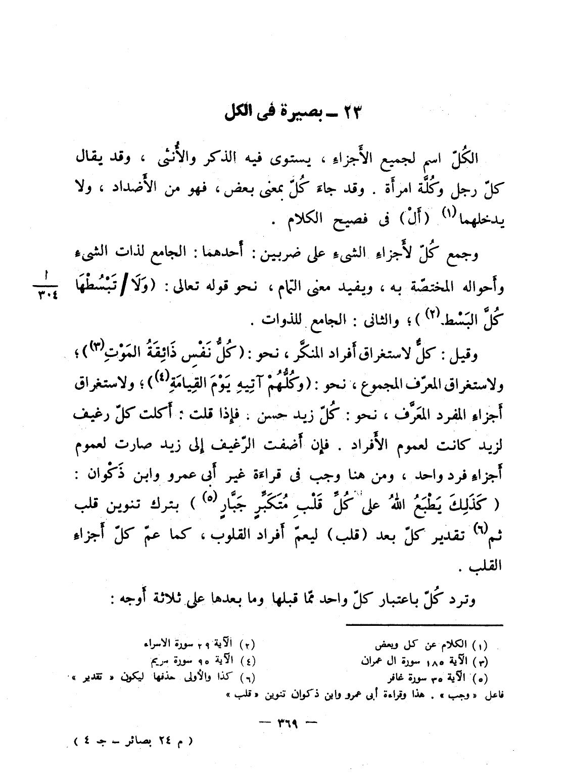 وقيل: كلٌّ لاستغراق أَفراد المنكَّر، نحو: {كُلُّ نَفْسٍ ذَآئِقَةُ الموت} ؛ ولاستغراق المعرّف المجموع، نحو: {وَكُلُّهُمْ آتِيهِ يَوْمَ القيامة} ؛ ولاستغراق أَجزاءِ المفرد المعَرَّف، نحو: كُلّ زيد حسن. فإِذا قلت: أَكلت كلّ رغيف لزيد كانت لعموم الأَفراد. فإِن أَضفت الرّغيف إلى زيد صارت لعموم أَجزاءِ فرد واحد، ومن هنا وجب فى قراءَة غير أَبى عمرو وابن ذَكْوان: {كَذَلِكَ يَطْبَعُ الله على كُلِّ قَلْبِ مُتَكَبِّرٍ جَبَّارٍ} بترك تنوين قلب ثم تقدير كلّ بعد (قلب) ليعمّ أَفراد القلوب، كما عمّ كلّ أَجزاءِ القلب.