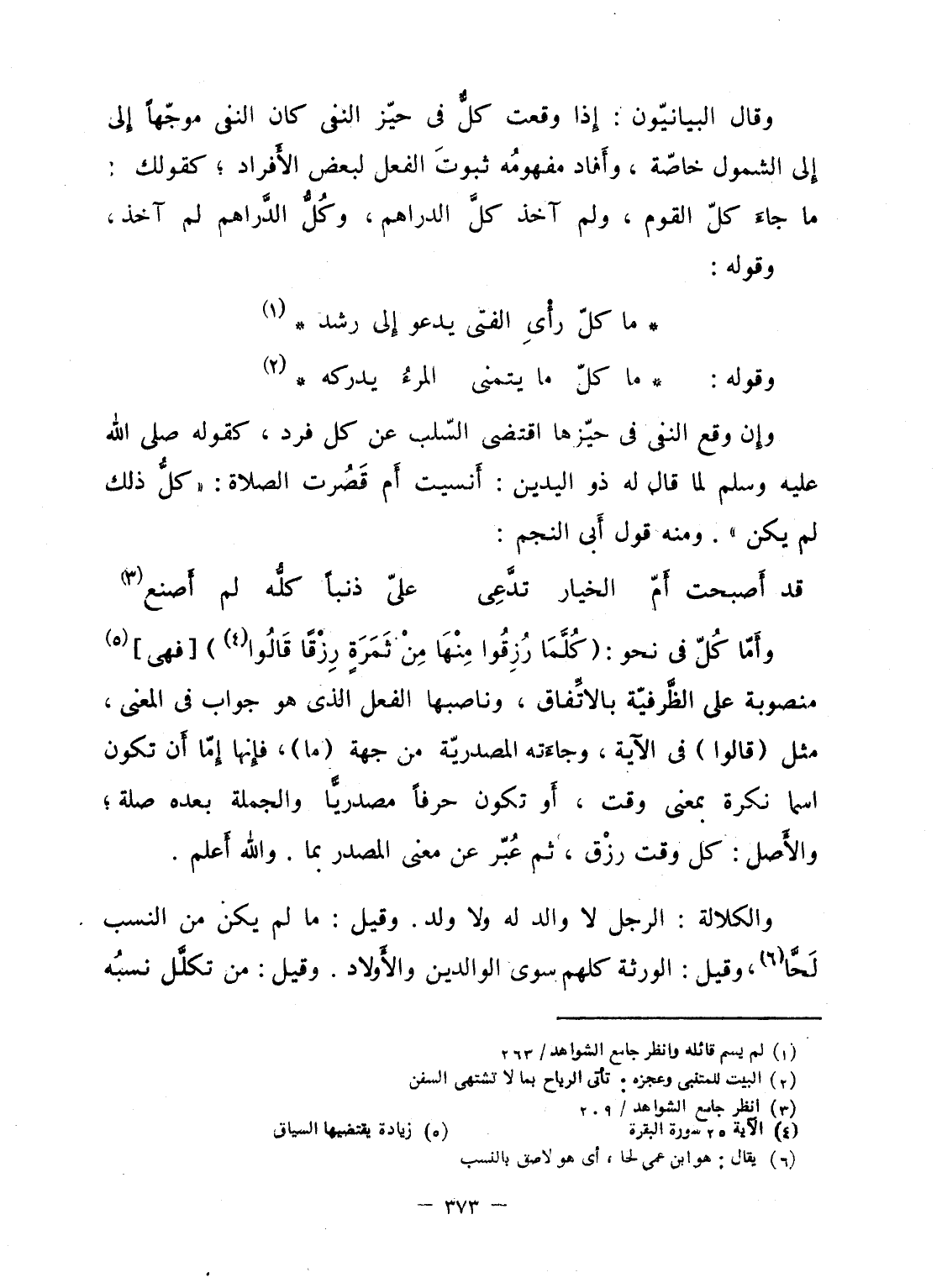 وإِن وقع النفى فى حيّزها اقتضى السّلب عن كل فرد، كقوله صلى الله عليه وسلم لما قال له ذو اليدين: أَنسيت أَم قَصُرت الصلاة: "كلُّ ذلك لم يكن". ومنه قول أَبى النجم: