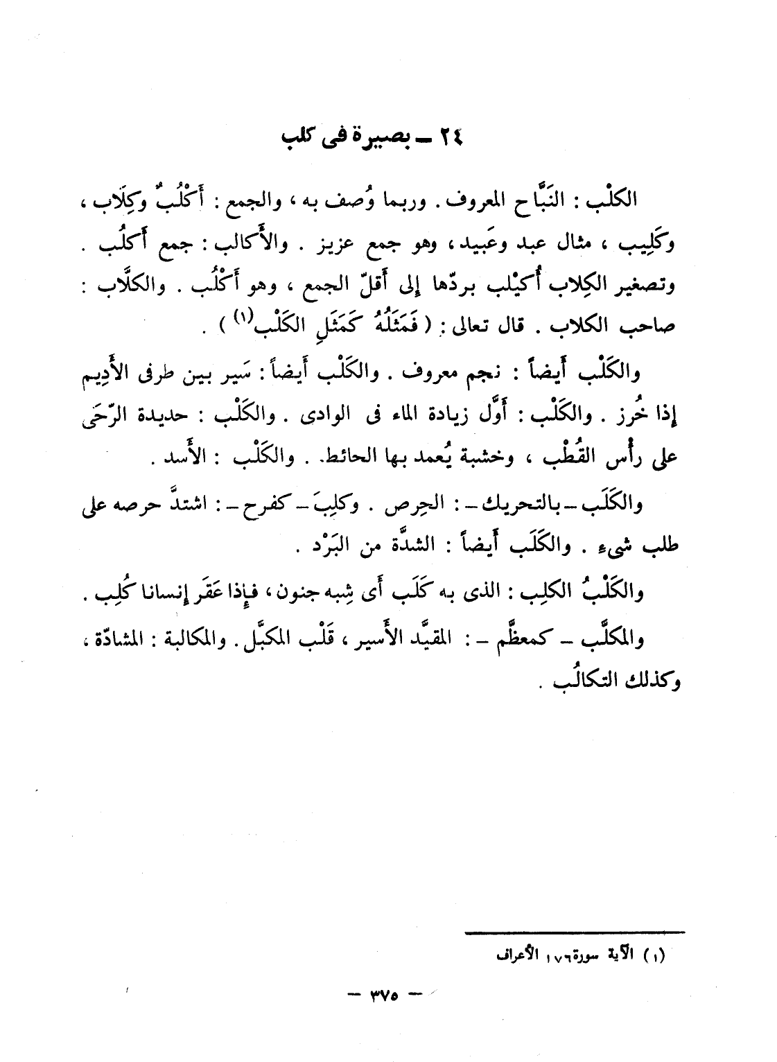 والكَلْب أَيضاً: نجم معروف. والكَلْب أَيضاً: سَير بين طرفى الأَدِيم إِذا خُرز. والكَلْب: أَوَّل زيادة الماء فى الوادى. والكَلْب: جديدة الرّحَى على رأْس القُطْب، وخشبة يُعمد بها الحائط. والكَلْب: الأَسد.