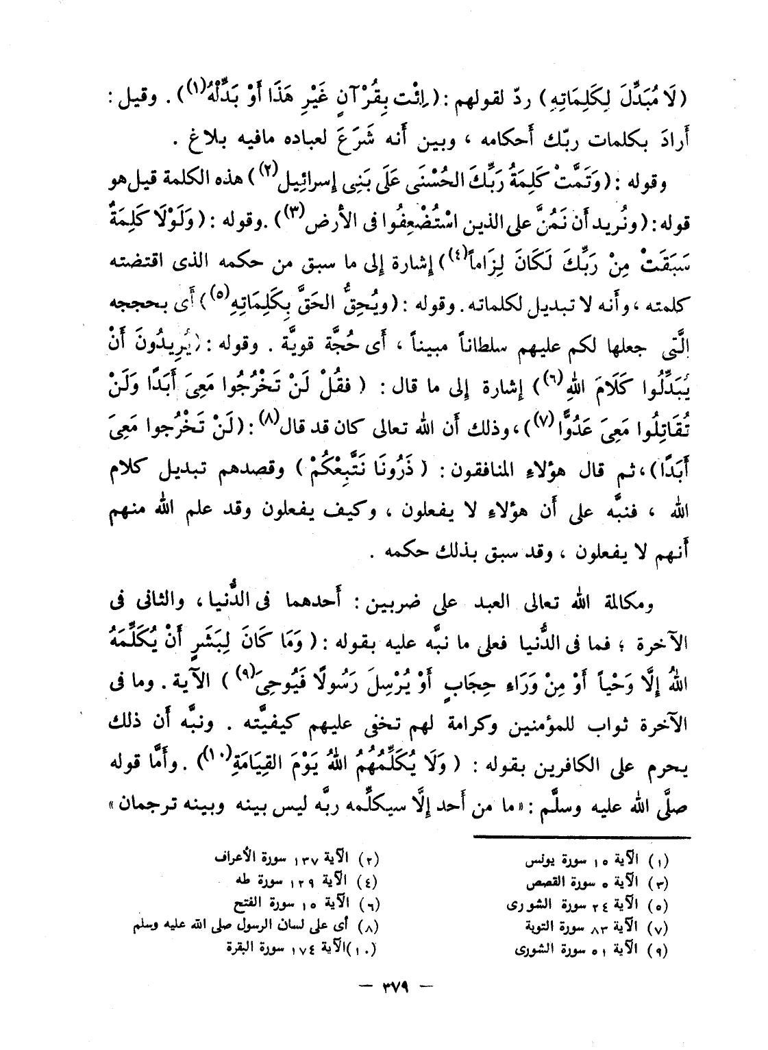 وقوله: {وَتَمَّتْ كَلِمَةُ رَبِّكَ الحسنى على بني إِسْرَآئِيلَ} هذه الكلمة قيل هو قوله: {وَنُرِيدُ أَن نَّمُنَّ عَلَى الذين استضعفوا فِي الأرض} . وقوله: {وَلَوْلاَ كَلِمَةٌ سَبَقَتْ مِن رَّبِّكَ لَكَانَ لِزَاماً} إِشارة إِلى ماسبق من حكمه الذى اقتضته كلمته، وأَنه لا تبديل لكلماته. وقوله: {وَيُحِقُّ الحق بِكَلِمَاتِهِ} أَى بحججه الَّتى جعلها لكم عليهم سلطاناً مبيناً، أَى حُجَّة قويَّة. وقوله: {يُرِيدُونَ أَن يُبَدِّلُواْ كَلاَمَ الله} إِشارة إِلى ما قال: {فَقُل لَّن تَخْرُجُواْ مَعِيَ أَبَداً وَلَن تُقَاتِلُواْ مَعِيَ عَدُوّاً} ، وذلك أَن الله تعالى كان قد قال: {لَّن تَخْرُجُواْ مَعِيَ أَبَداً} ، ثم قال هؤلاءِ المنافقون: {ذَرُونَا نَتَّبِعْكُمْ} وقصدهم تبديل كلام الله، فنبَّه على أَن هؤلاءِ لا يفعلون، وكيف يفعلون وقد علم الله منهم أَنهم لا يفعلون، وقد سبق بذلك حكمه.